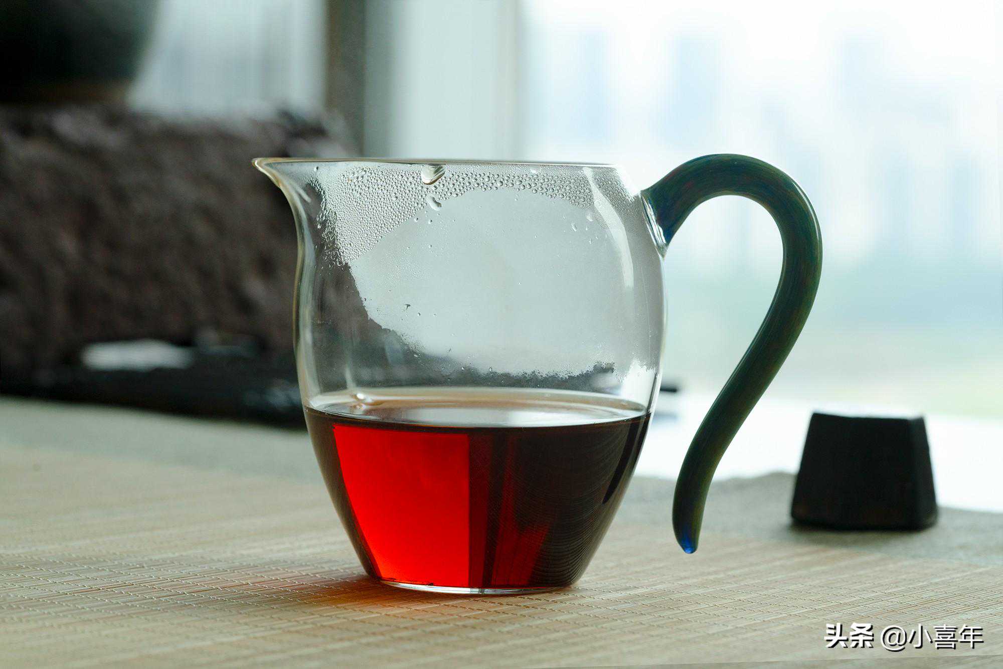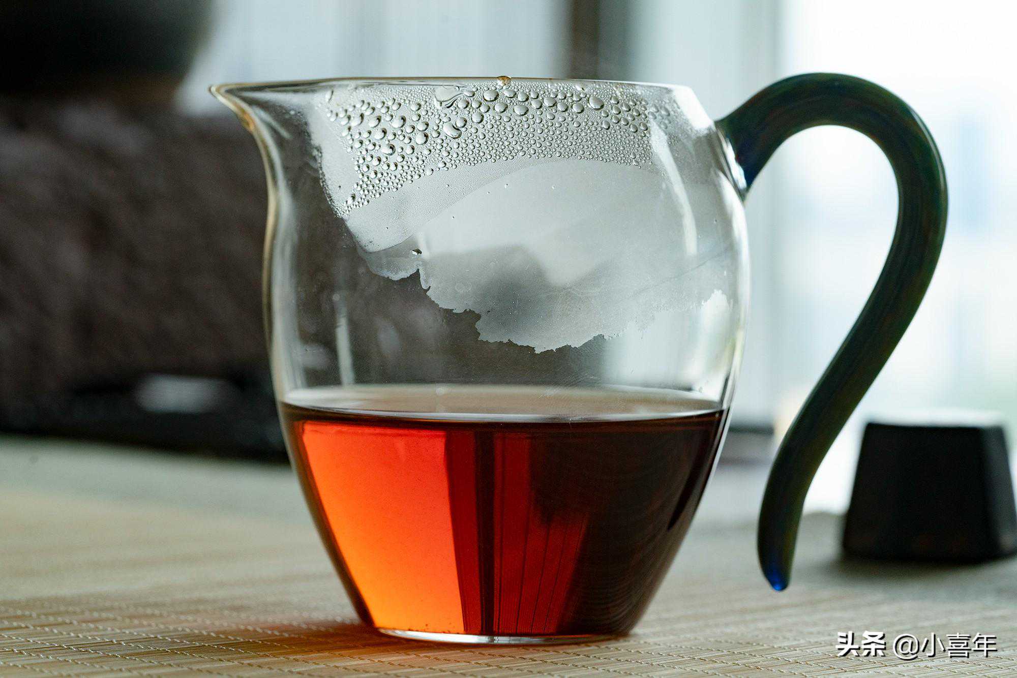 观玻璃公道杯中的汤色,前7泡红褐透亮,后面几泡颜色逐渐变浅。