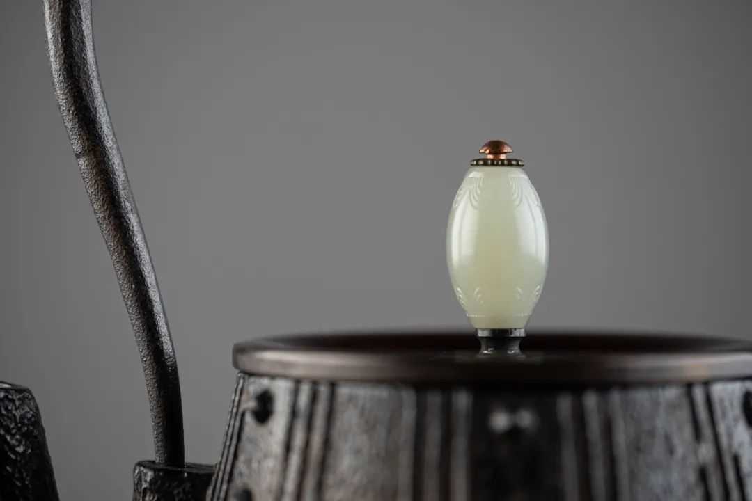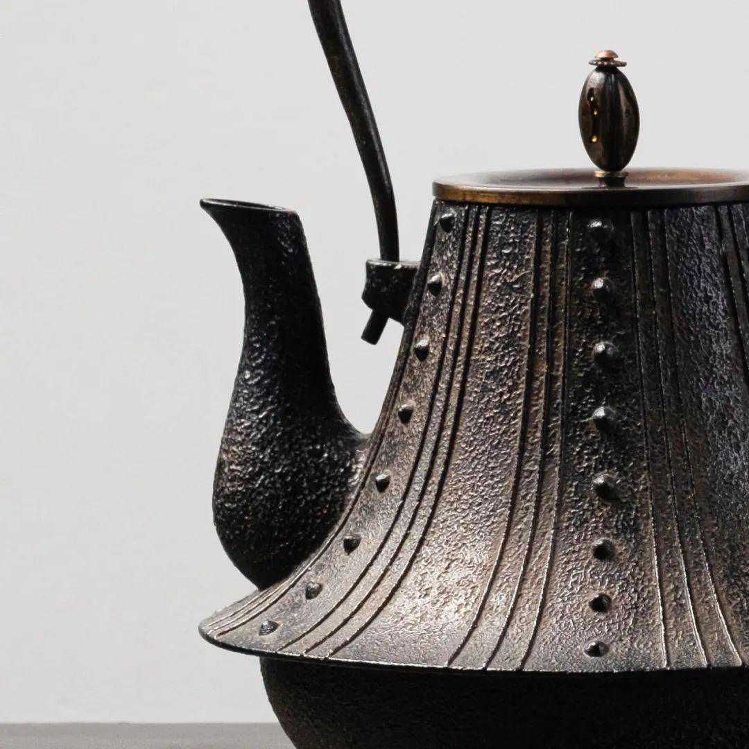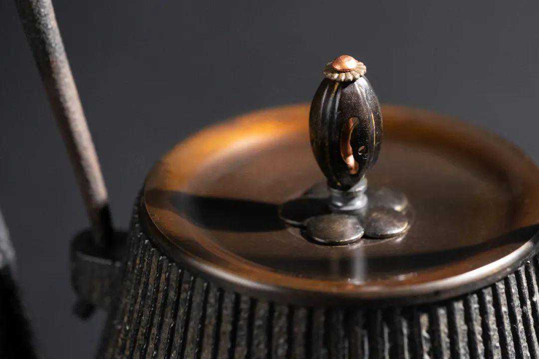 配以精致的铜钮盖,与壶身形成颜色反差。铜盖在日本也被称为“唐金盖”,铜在江户时期的价格远远高于铁,拥有一把唐金盖的京都铁壶,成了名人贵族彰显财力的方式。