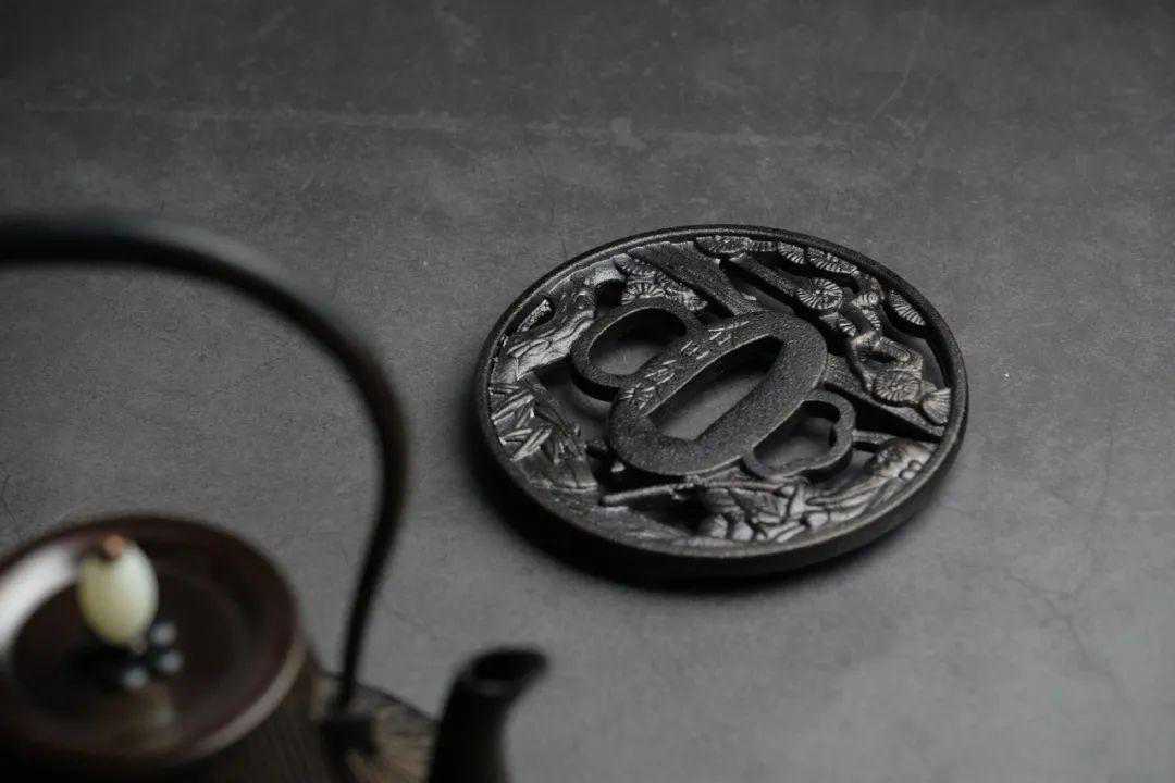 本系列另含刀格壶垫,样式取自武士刀制刀世家,甲冑師春田氏所制的,锦菊纹样与菊瓣筋纹的铁壶外壁遥相呼应。菊与刀也成了日本文化的代表,恬淡而残忍,绚丽而尚武。