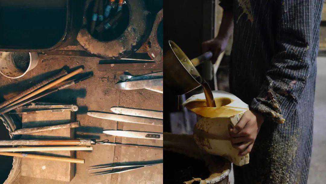 将铸模逐个取出窑外,再由釜师将1500℃左右的铁浆快速倒入铸模。铸模冷却一夜后,用锤小心敲除铸模,取出铸件。