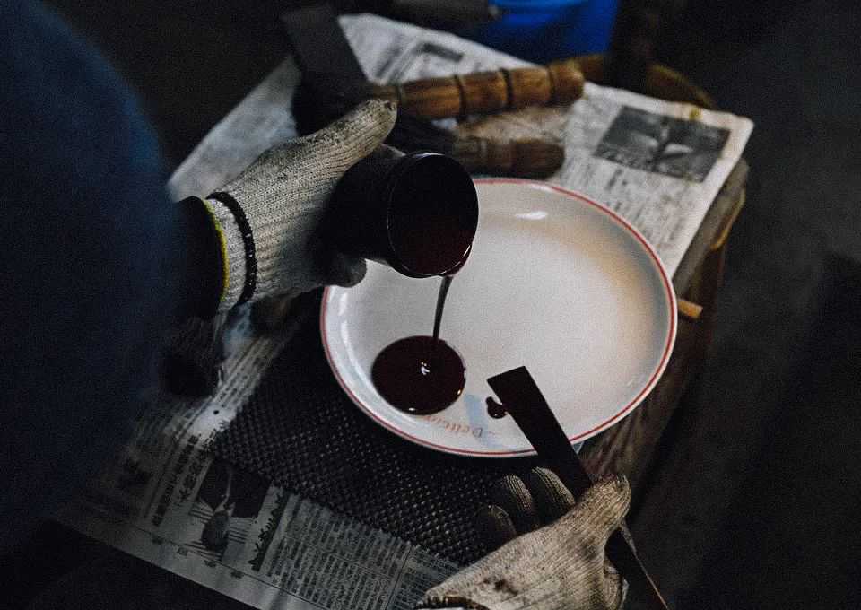 铸成淬火可以达到防锈的目的。铸好的铁壶重新入窑,800℃高温烧制40分钟,冷却后,用蒿草刷涂抹上植物漆与茶汁的混合图层,刷涂烘烤3-5次,可以使铁壶内外光泽油润,耐腐耐锈。