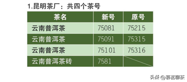 1976年,云南省茶叶进出口公司在《关于加工生产普洱茶的样价及有关问题的暂行规定》中,对普洱茶用唛号来完善信息管理,在茶叶贸易中用数字表示的茶叶年份、等级、厂家等。紧压茶头两位数代表拼配和发酵技术标准的年代,第三位数代表茶叶等级,第四位数代表生产厂家,昆明茶厂为1、勐海茶厂为2、下关茶厂为3、普洱茶厂为4。
