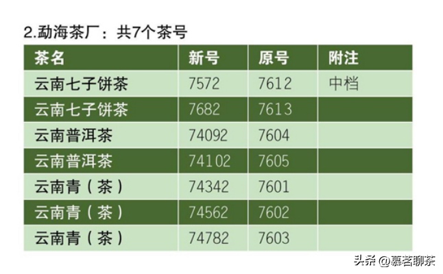 一是不规范茶号,比如:7262、7222、7042、7062等茶号,完全与级别或创制年代无关;二是用传统茶号生产不同的产品,比如7572竟然出现了生茶这些茶是彻底的茶商订制茶,是茶厂在经济不景气,买方说了算的情况下的无奈的选择。三是很多民营茶厂也开始生产自己的编号茶,他们大多喜欢以8或6作为茶厂代号来为茶号结尾。当然,原中茶系统还有很多不常用的唛号,比如7312、7502、7512、7692、7752、7762、7902、9252等,真是令人眼花缭乱。但这些非传统茶号或者产量不大,或者已像7262高档熟饼、421高档散茶那样被广大茶友所接受,自然,这一问题也就不那么令人困惑了。