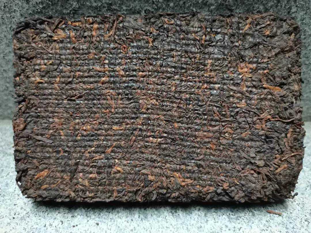 70年代茶砖背面有明显的网格麻包纹。唯独75年这款实验砖茶拼配了8%的红副茶(有极强的辨识度/红茶未)