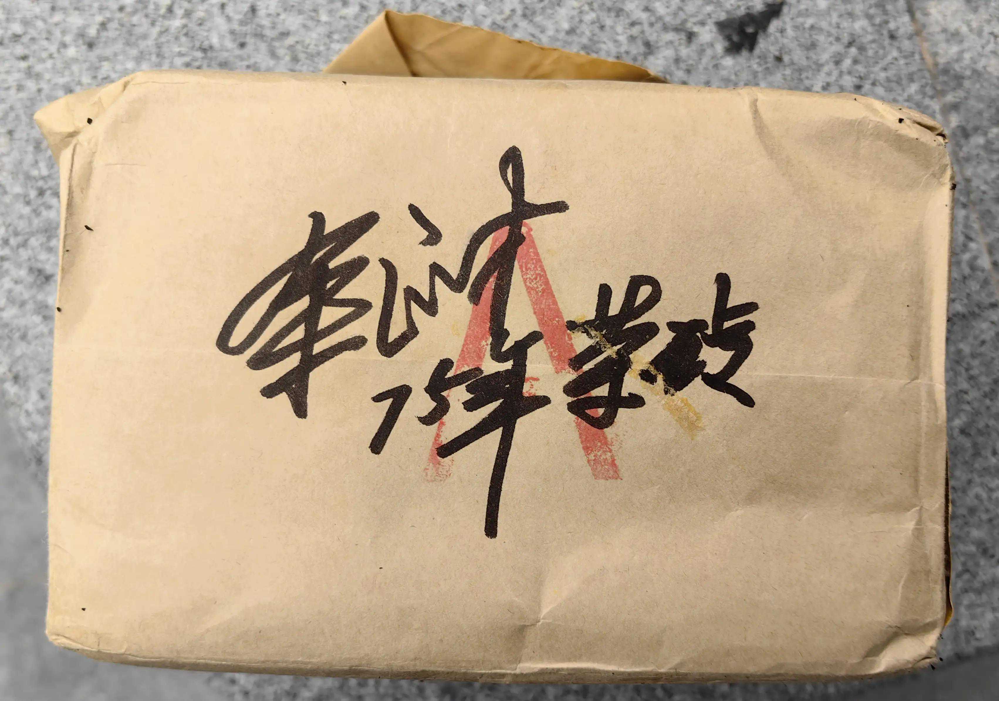 这款75年勐海茶厂创作的实验砖茶是现代普洱茶分水岭中茶品的标志,是75打头唛号(如7562、7572、7581等)75两字所要纪念75年人工发酵技术成功(国家保密技术)的一款文物级实物砖茶,