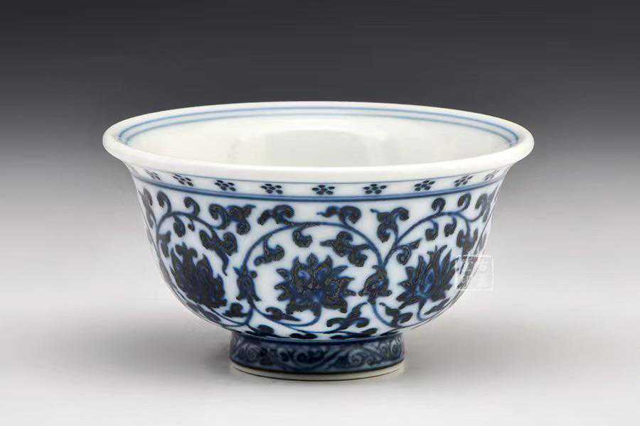 余寅窑青花缠枝莲压手杯