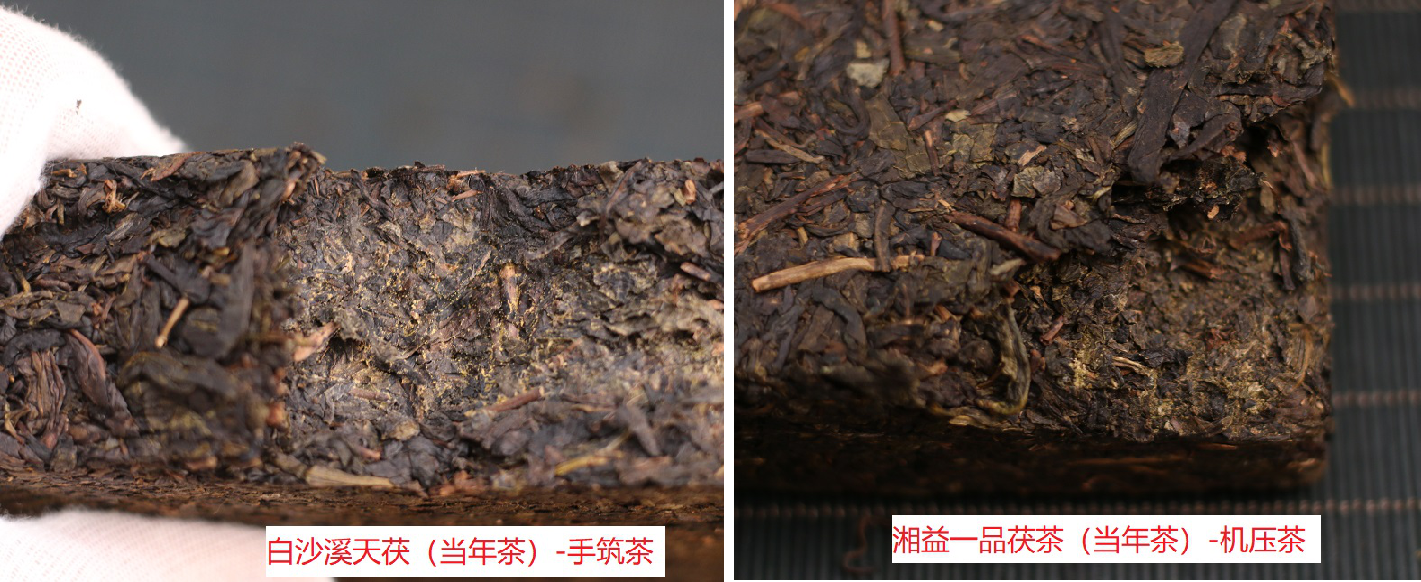 一般来说,手筑茶用手轻轻掰一下,就能感觉到茶砖形变。但机压茶密度高,茶体紧实,一般很难掰动。下面是湘益一品茯茶(机制茶)和百年木仓手工金茯(手筑茶)的茶砖断面实拍,直观看茶叶内部也是手筑茶更松散。