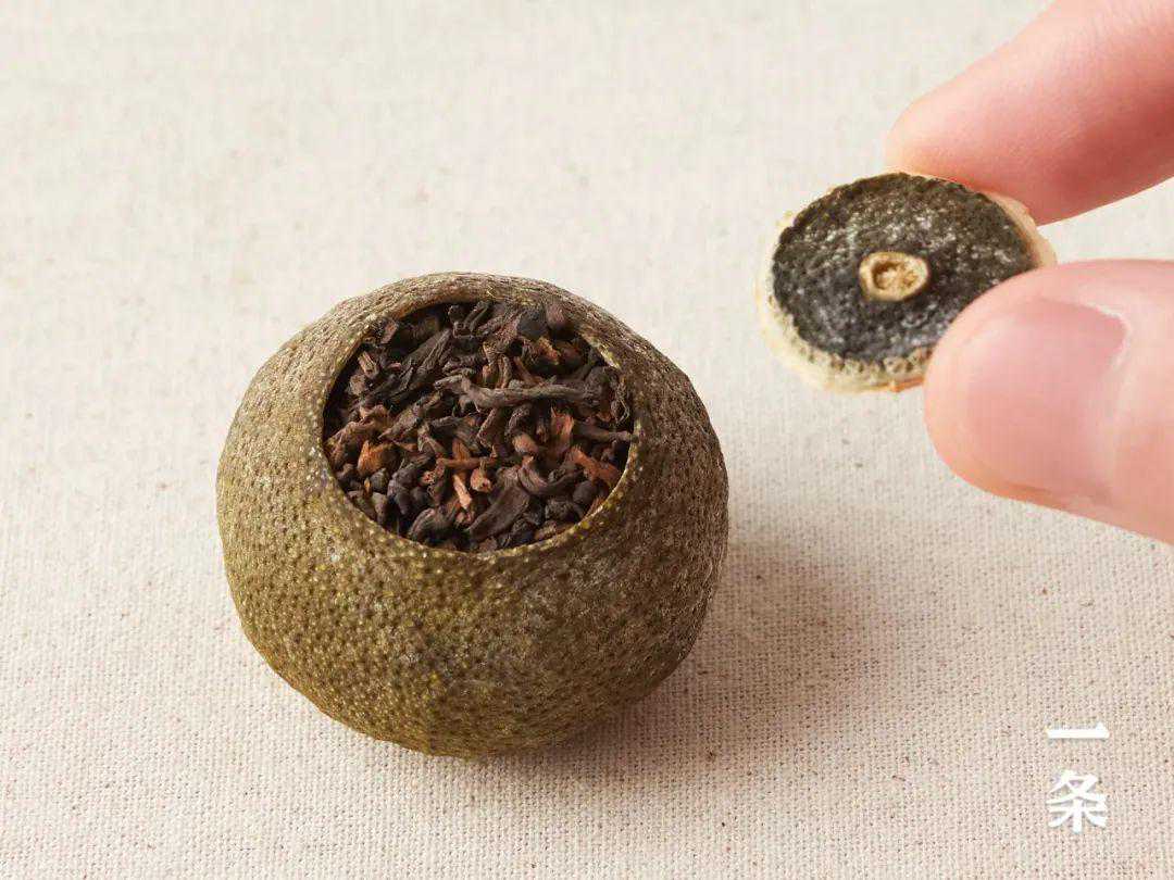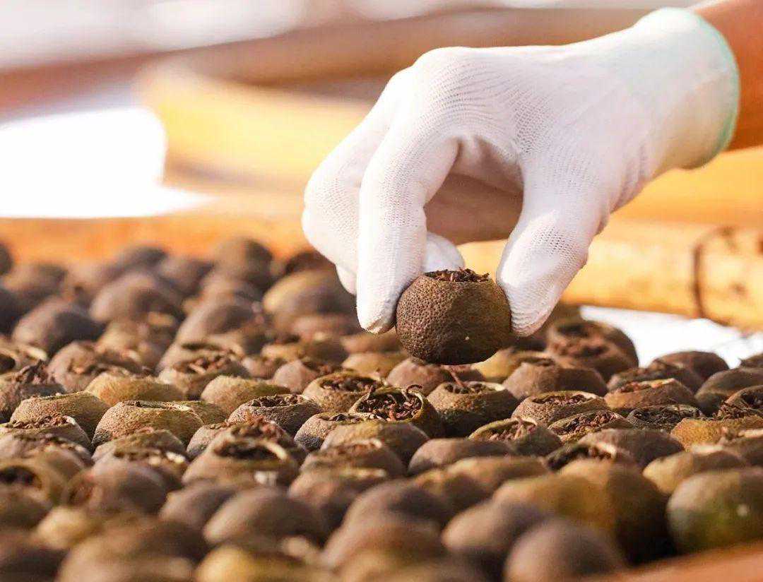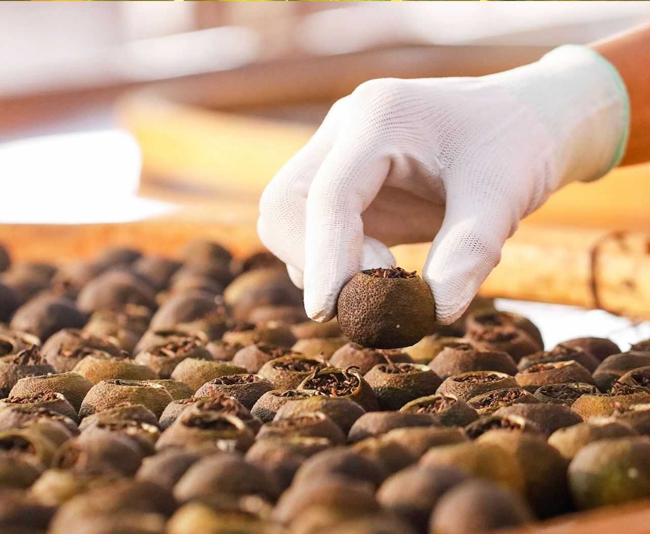 将幼年时期的小柑橘摘下,掏空果实,填入普洱熟茶后,杀青烘焙,便成了小青柑。