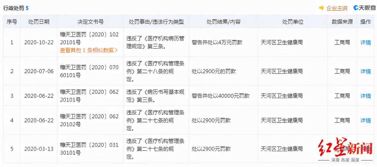 此外,据天眼查APP显示,广州熙施时光医疗美容门诊部有限公司曾于2020年3月至10月遭到5次行政处罚,处罚事由为违反《医疗机构病历管理规定》及《医疗机构管理条例》,该公司还涉及一起医疗服务合同纠纷。