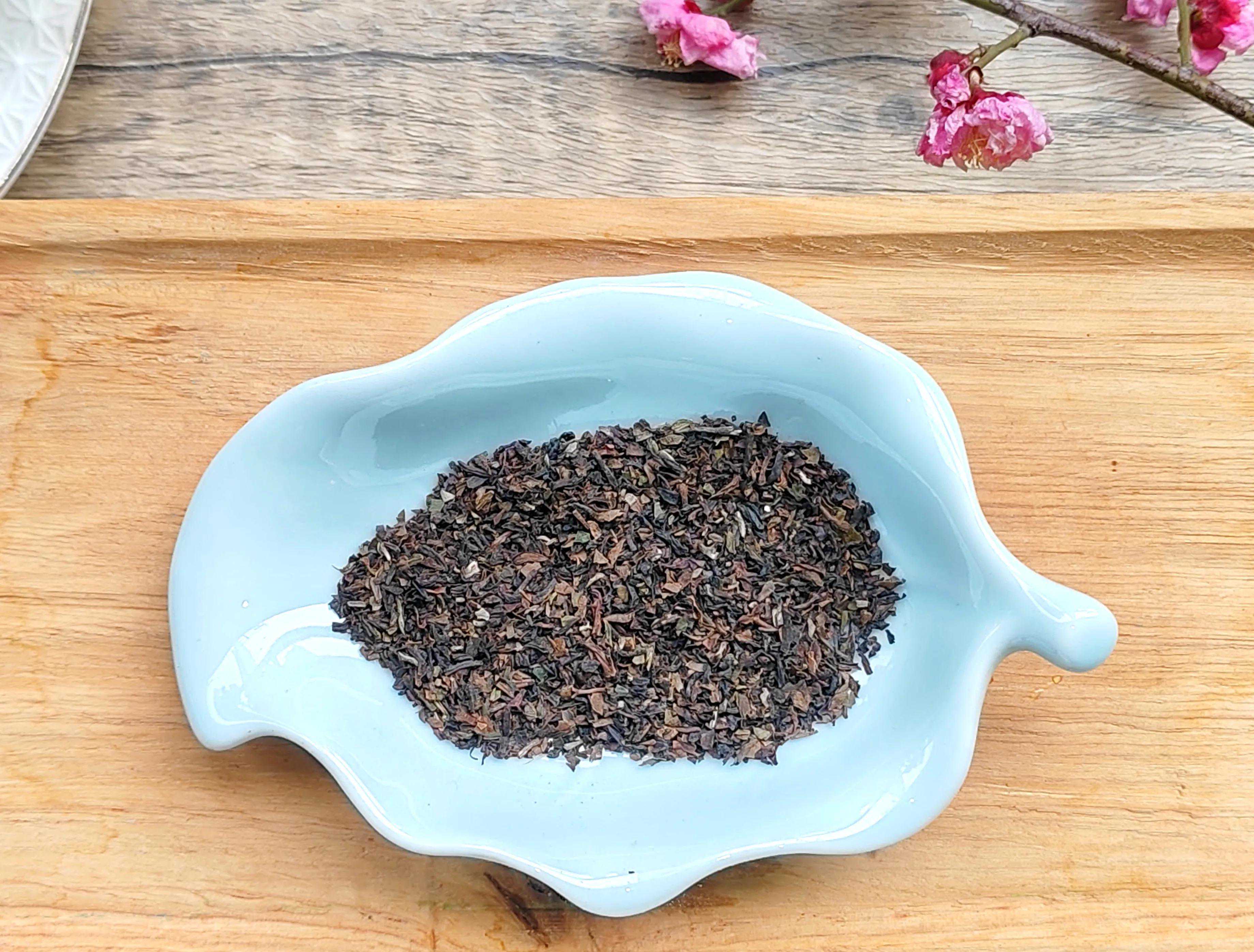 条索较细碎、褐色,香气浓郁较好,从干茶可见发酵程度较轻。