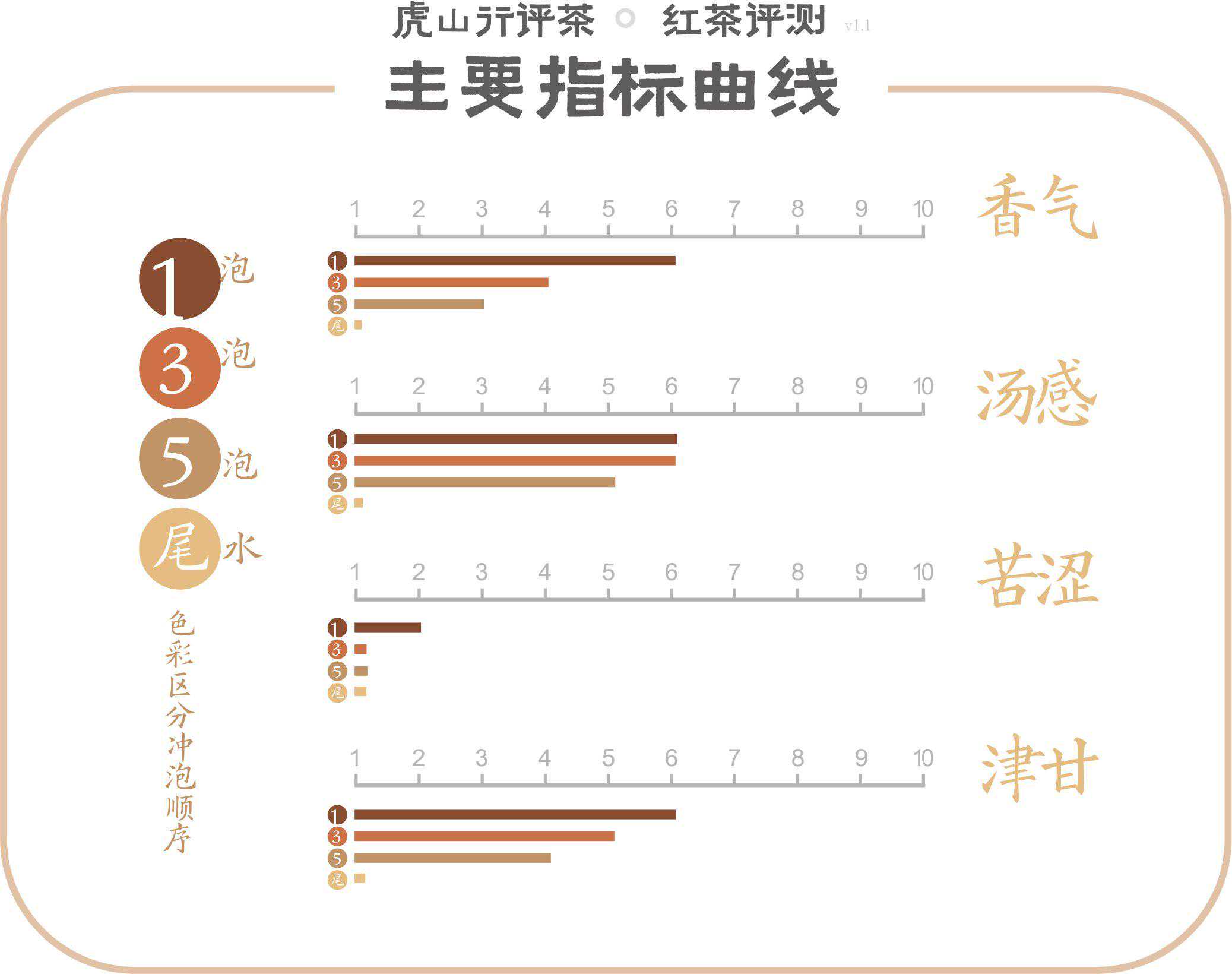 解析:指标图示可见香气浓郁不错,但下降太快,这与碎茶形态有关,尾水香气偏弱。汤感厚度有较好表现,稳定性也比较好。苦涩度控制也很不错,只是中尾水几无涩感。生津回甘强度同样如此,持续性也很好,回甘留存很持久,尤其是香气。