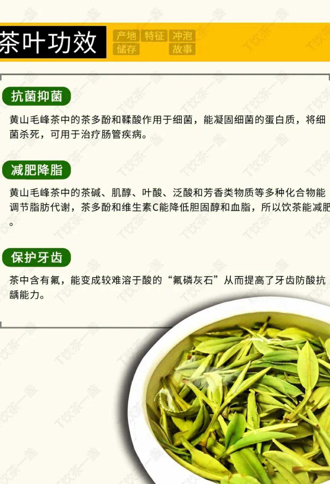 黄山毛峰是中国十大名茶之一,属于绿茶。产于安徽省黄山(徽州)一带,所以又称徽茶。由清代光绪年间谢裕大茶庄所创制。每年清明谷雨,选摘良种茶树“黄山种”、“黄山大叶种”等的初展肥壮嫩芽,手工炒制,该茶外形微卷,状似雀舌,绿中泛黄,银毫显露,且带有金黄色鱼叶(俗称黄金片)。入杯冲泡雾气结顶,汤色清碧微黄,叶底黄绿有活力,滋味醇甘,香气如兰,韵味深长。由于新制茶叶白毫披身,芽尖峰芒,且鲜叶采自黄山高峰,遂将该茶取名为黄山毛峰。