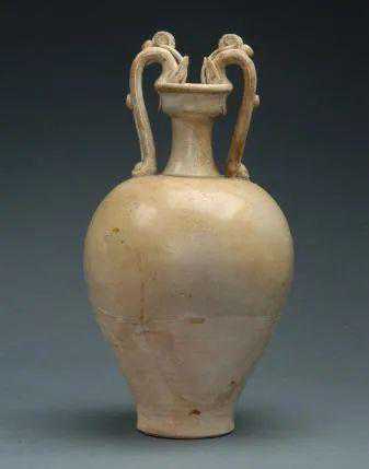 此尊颈两侧的提把部分被制作成两条龙的形象,龙身立起,龙头探向尊口,呈吸水状。此尊双龙曲线优美,造型形象逼真,釉色圆润饱满,除底部外通体施青釉,是典型的唐代瓷器器形。