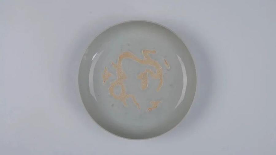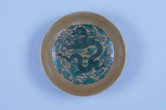 盘内心绘云龙纹,其中以墨彩勾勒纹饰轮廓,再以绿彩填绘。