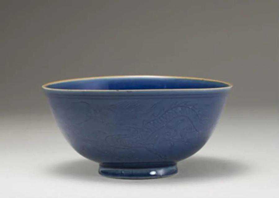 内壁釉下刻双龙及四朵云纹,龙似行于云雾之中,在日光或灯光的照射下,似隐似现,神态雄健,栩栩如生。现藏青岛市博物馆。
