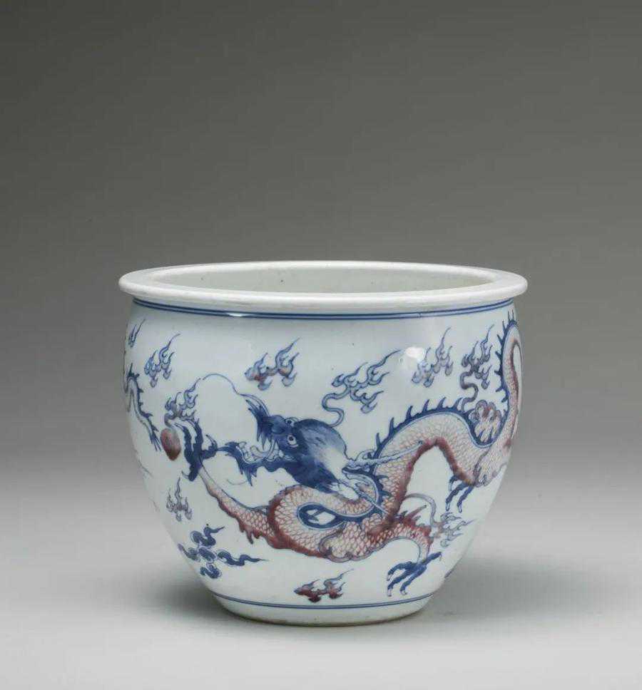 方唇平沿,斜弧腹,下腹内收,平底。胎质洁白坚致,胎体厚重。釉面匀净滋润。口沿下和底部各有两道细弦纹,腹部绘云龙戏珠纹,以青花绘云纹、龙纹外部轮廓,釉里红填涂,云龙张牙舞爪,奔驰互戏,戏弄一火珠。