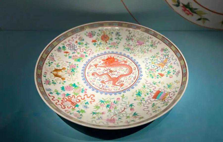 “水深波浪阔,无使蛟龙得。”在这件清粉彩八宝云龙大盘上,盘踞中心的“粉彩龙”体态矫健,龙爪雄劲,在云雾波涛中翻腾、驰骋。