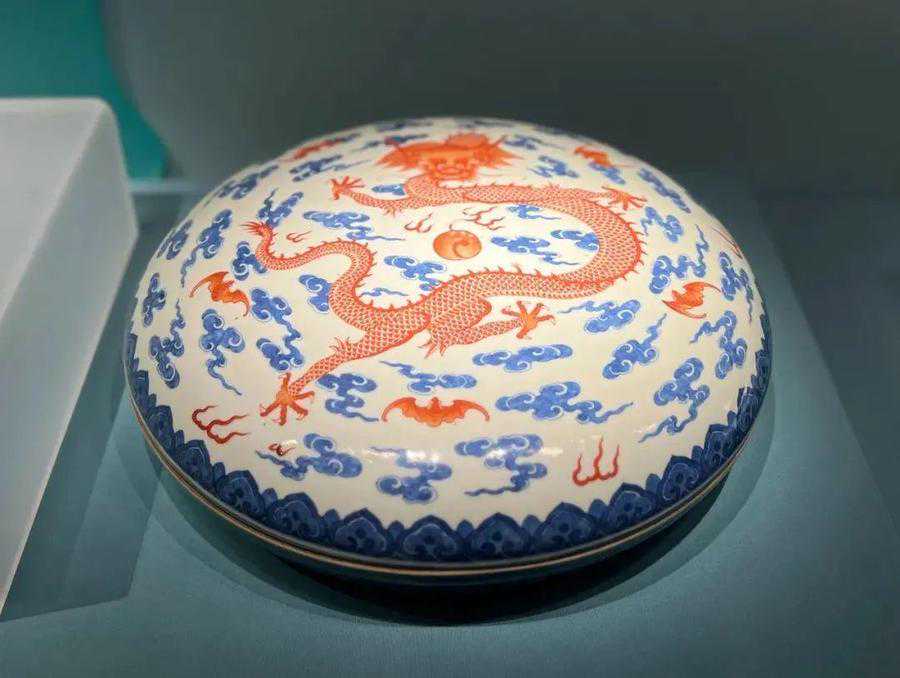 青花釉里红瓷器融合这两种瓷器的烧制方法,烧制难度极高,因此产量稀少,这件红彩云龙格盒造型精美,龙纹活灵活现,堪称精品。
