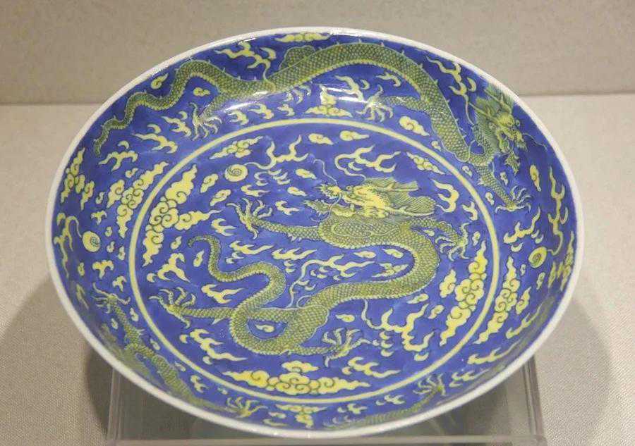 这件器物通体蓝釉,盘心中央双圈开光内施黄彩绘龙戏珠纹,龙在云间腾空舞动,飘逸动人,周饰祥云伴其左右,所绘龙纹娇健强劲,祥云福瑞旋停。