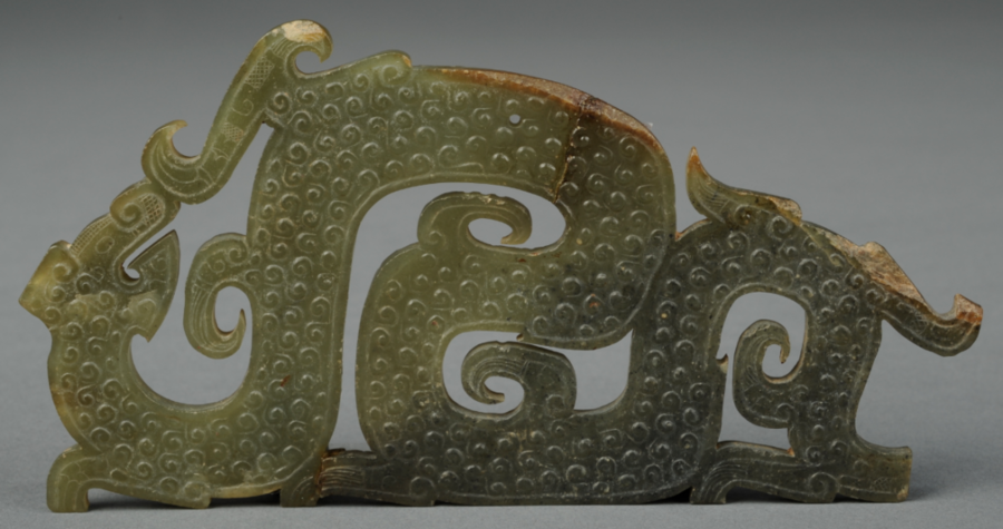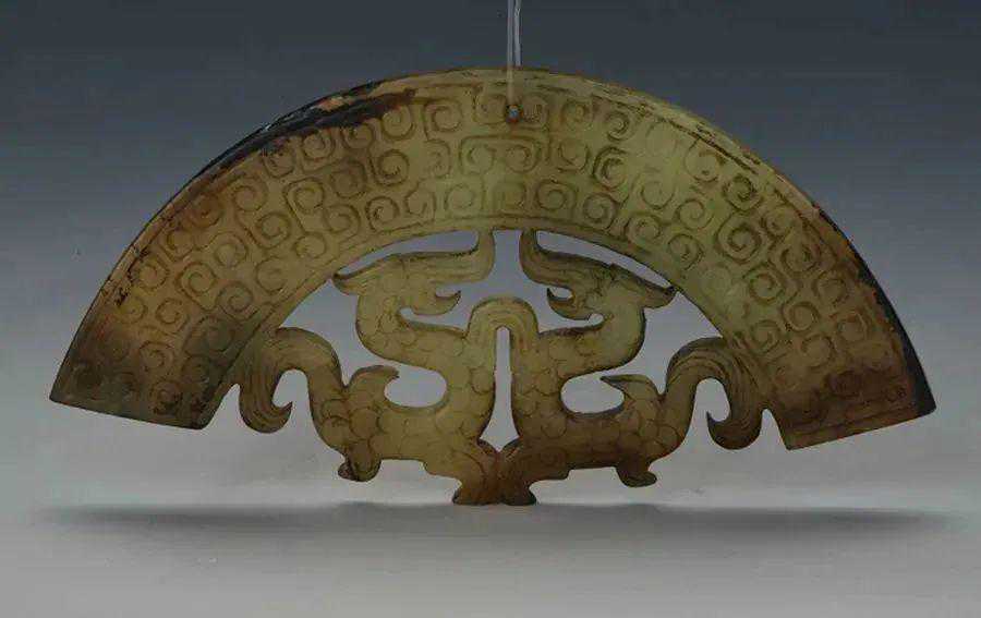 璜身满刻勾云纹,璜下装饰透雕双龙,相向而视,龙角上扬,口微张上卷,尾下垂卷曲,龙身刻鳞纹。其上双龙造型生动传神,线条古朴简练。