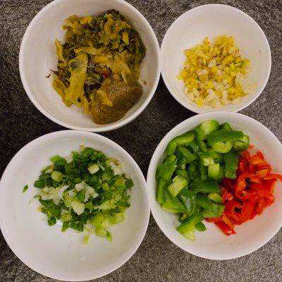 4、姜蒜、酸菜入锅炒香。