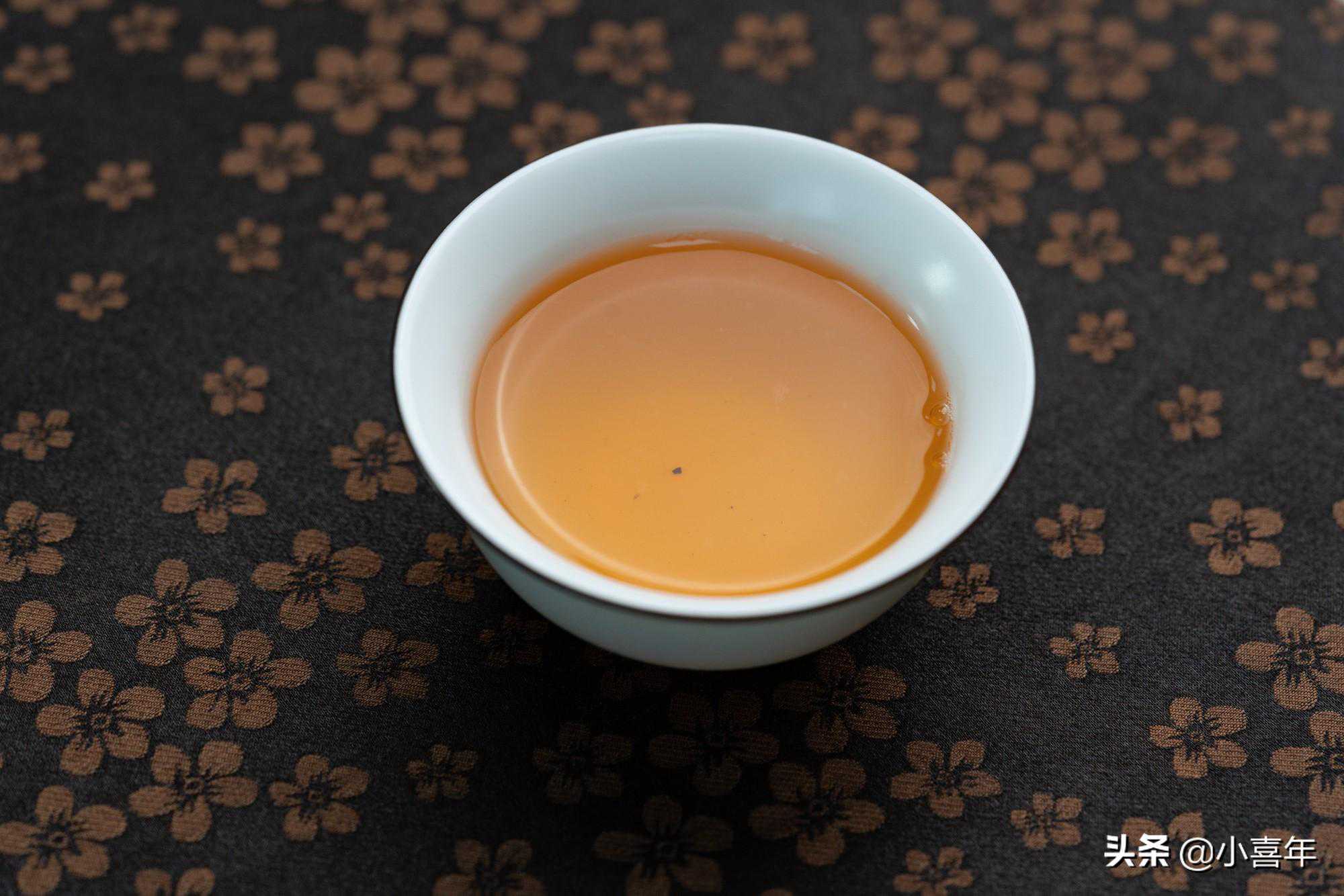 洗茶后的第一泡茶汤呈黄色,色泽较暗,很明显还没有泡开。第二泡开始茶汤的汤色变为金黄,颜色最深时橙黄偏红,色泽明亮,汤中伴有茶毫。
