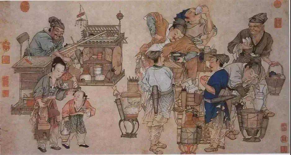 两宋时期,中国茶业进入鼎盛时代,论茶之风进一步兴盛,在宫廷、文士、僧侣、大众等各个茶文化圈中风行。如宋时民间的“卖茶担”,便处处体现中国的古茶俗之美。赤日炎炎,卖茶人于市井中沏煮茶汤遇行人少时,便担歇柳荫下,以斗茶为乐。《梦梁录》中记载:“在五间楼前大街坐铺中瓦前,有带三朵花点茶婆婆,敲响盏掇头儿拍板,大街游玩人们看了,无不晒笑。”这种以论茶取乐的习俗,正是当时市井的生活之美。