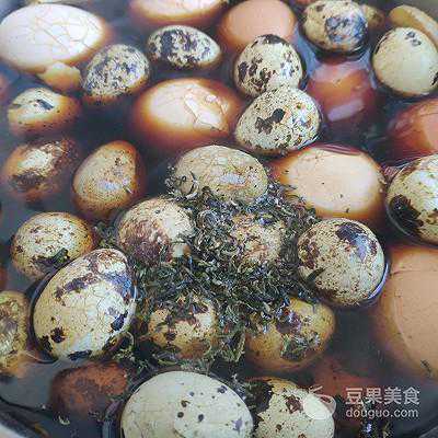 5、煮开,把鹌鹑蛋捞出来。鸡蛋不要捞出来,鸡蛋继续煮一分钟。把鹌鹑蛋表面敲碎。