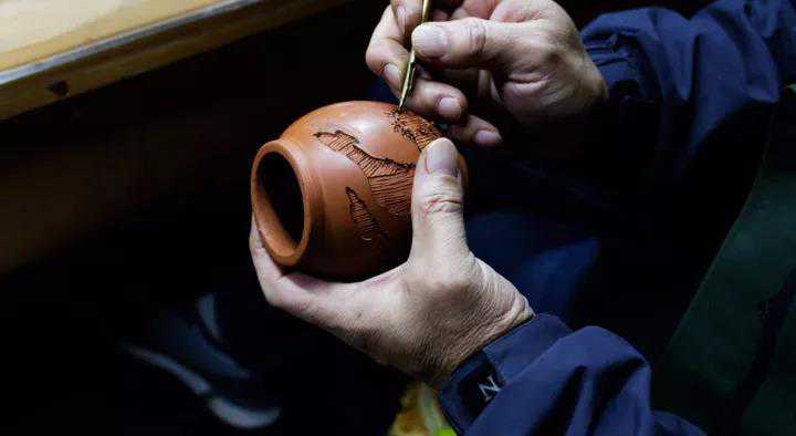 刻填这道工艺,起源难以追溯,但据史料考证,在清道光年间,经潘金怀、张好二人的改进,确立了以刻填、磨光为主的建水紫陶。
