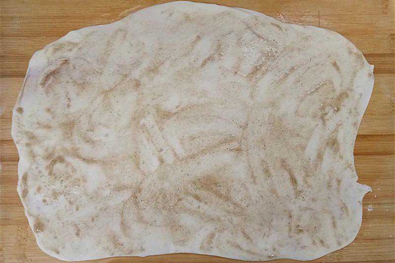 步骤7、取一份揉好的剂子擀成薄面片,抹上做好的油酥。(重点3、面片不能太薄也不要太厚,太厚普层次不分明,太薄操作的额时候容易扯破,大约两三毫米厚度就好)