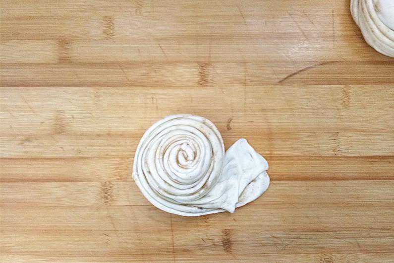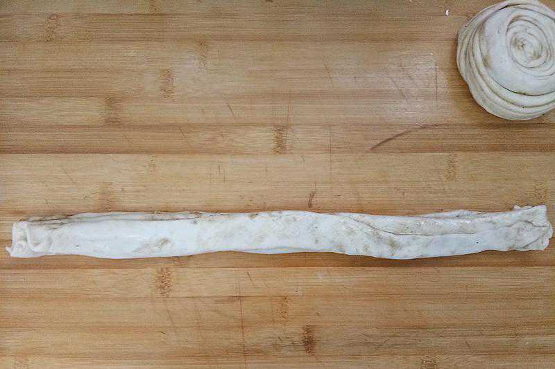 步骤9、叠好后从一头卷起,一边抻一边卷,(这样饼的每层层次会更薄,薄如纸的那种)最后剩一点面皮,把卷好的部分压在面头上。所有的做好后盖上保鲜膜再醒10分钟,(重点4、再次把做好的面团醒10分钟,是为了让面团的面筋更松弛,好擀,擀制的时候有也不会回缩,这步不要省)