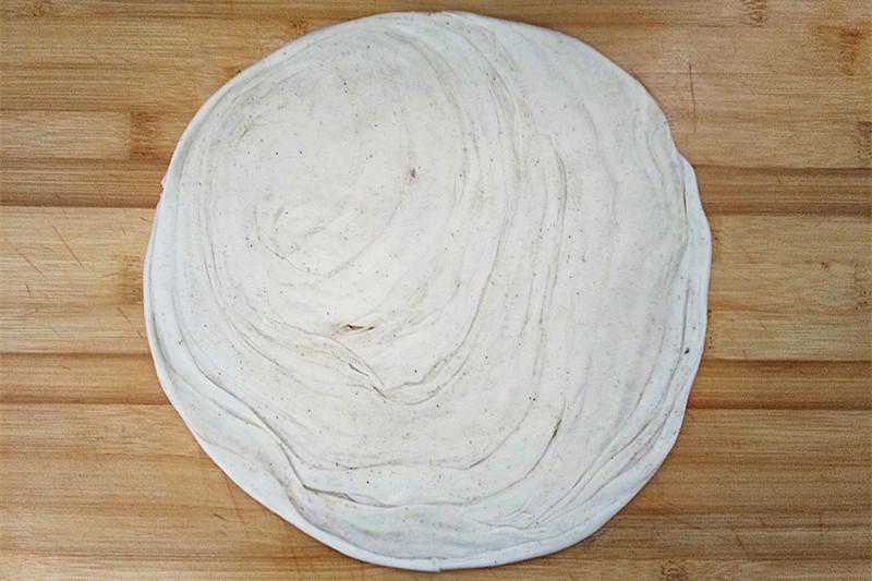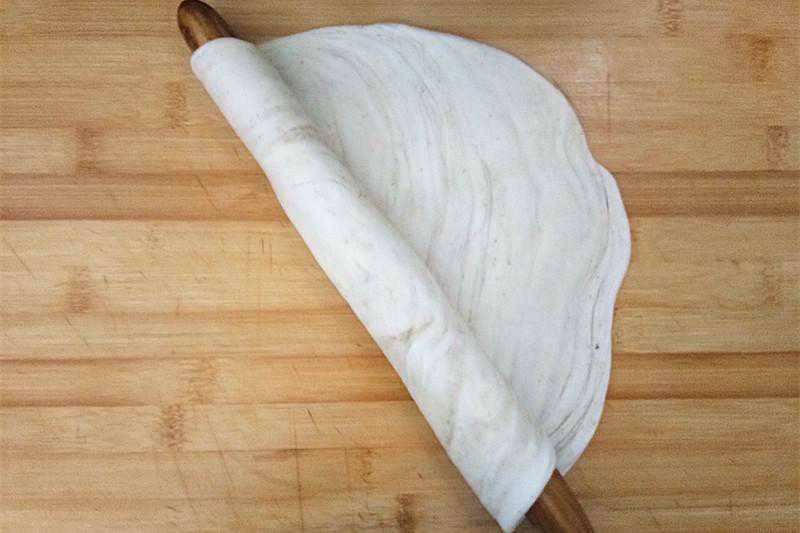 步骤11、擀好的饼坯比较薄,也比较软,用擀面杖来帮忙,把饼卷在擀面杖上。