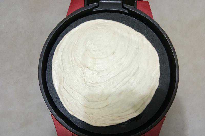 步骤12、电饼铛刷上少许食用油,放入擀好的饼。(饼的本身油就不少了,我家喜欢吃软一点的饼,泽瑞妈没有放太多油,如果想要酥脆就多加一些油)