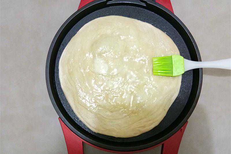 步骤13、放入饼后盖上盖子,大约1分钟后打开,在表面刷少许食用油。