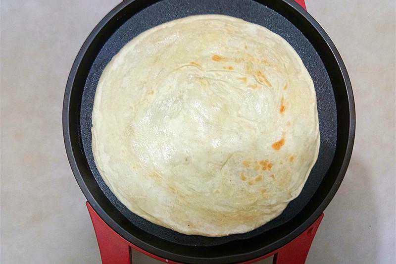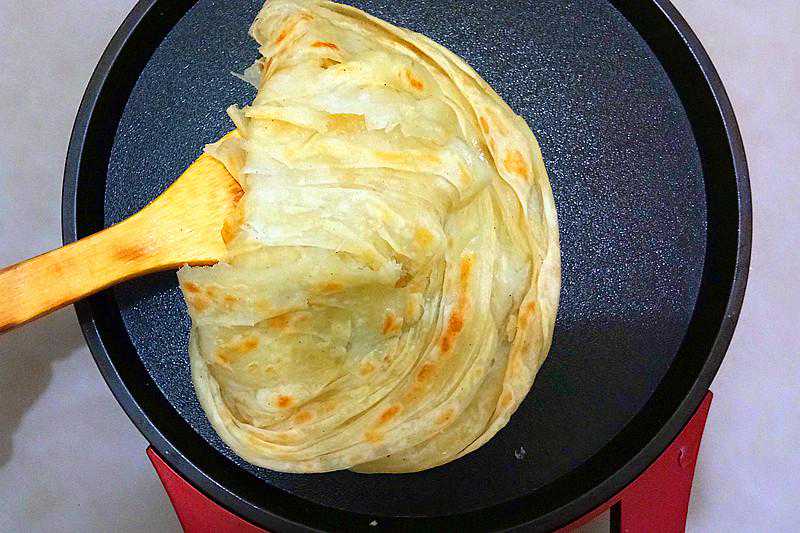 步骤15、煎烙的时候多次翻面,两面金黄即可出锅。(重点5、煎烙的时候多次翻面,用手铲拍打挤压饼坯,烙出来的饼会更松软,层次也会更多)