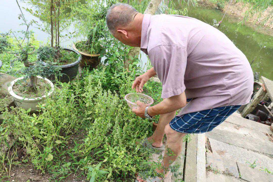 小编接着又来到周家3组的周阿婆家,这边花坛里的绿植长得正旺盛,其中不乏时令瓜果、茄子等蔬菜,几株罗勒也绿意盎然。“一般揪头上的嫩叶泡茶,早上煮好了可以喝一天。现在这么热的天气刚好清凉解暑。”