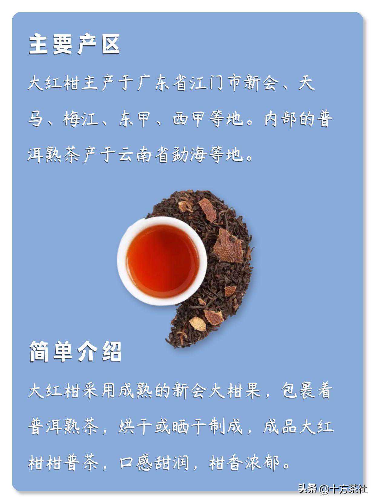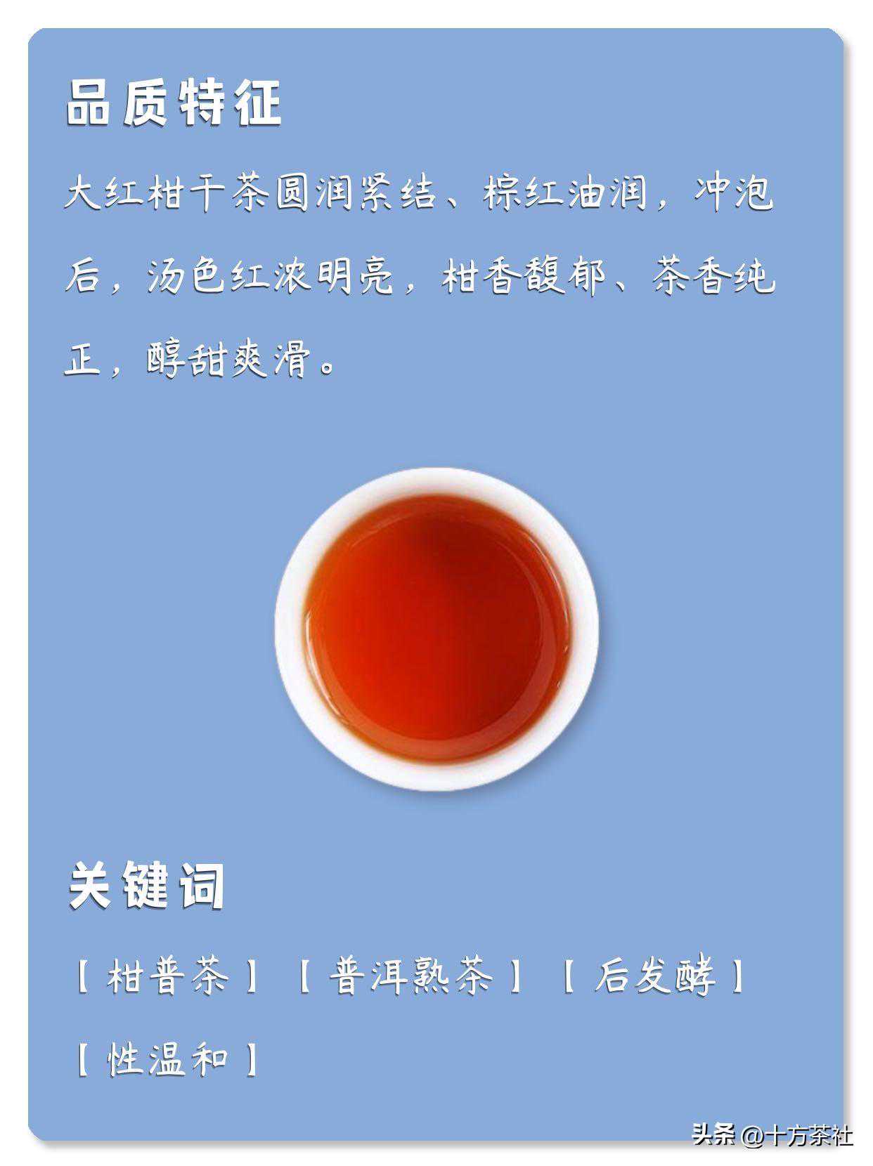 相对小青柑来说,大红柑口感更加甜润、醇厚。因为有更多的果香类芳香物质与海绵松丝,所以大红柑可以更好地保护肠胃、降血压。