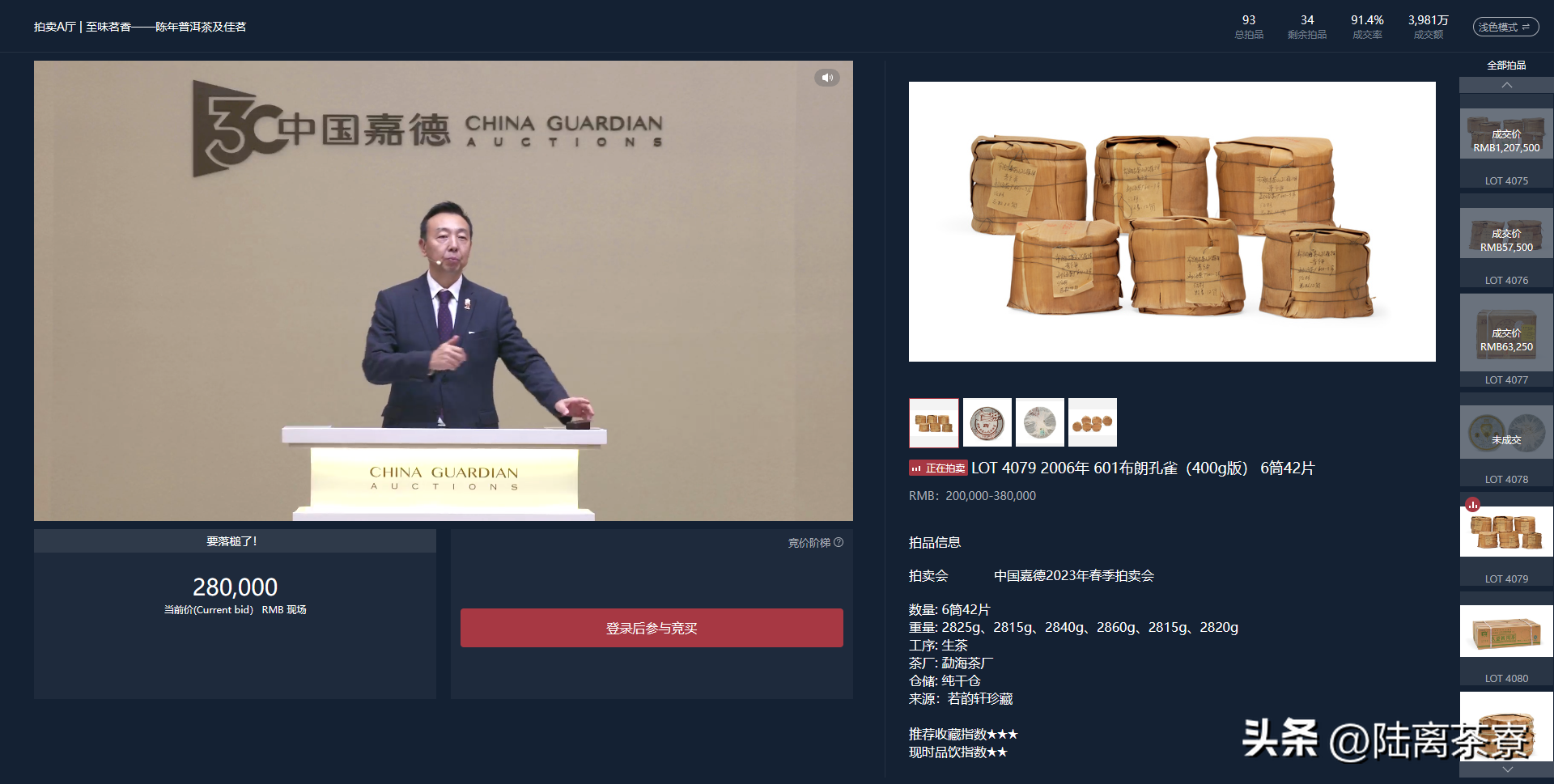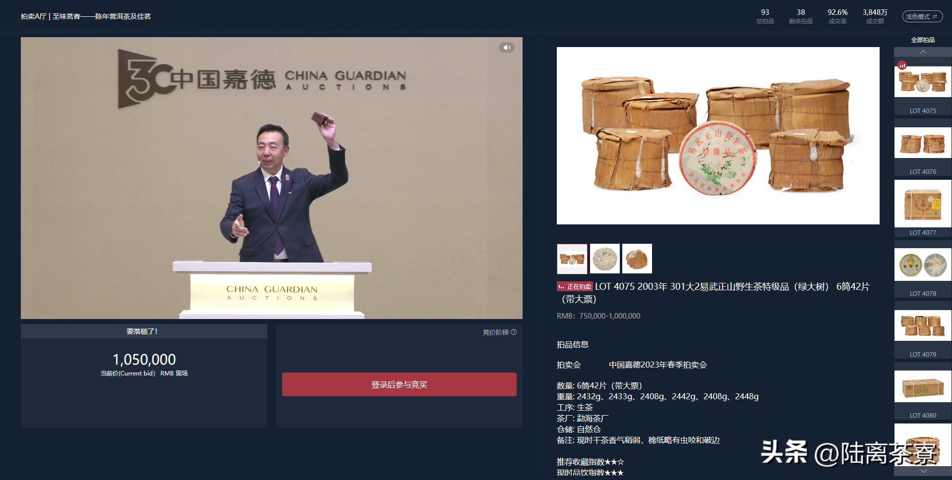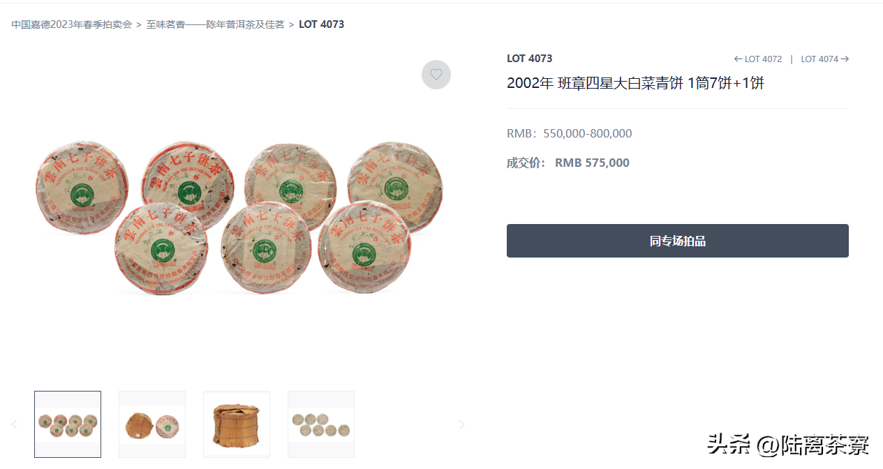 而在陆离看来,其流拍的最大原因可能是整件规格+茶品不算出名,早春乔木在圈内虽然有一定名字,但在嘉德这种顶级拍卖场上还是太不显眼了,整件的规格又决定了其需要找到对的人才能成交,两种因素叠加之下,没找到买家也不算奇怪。