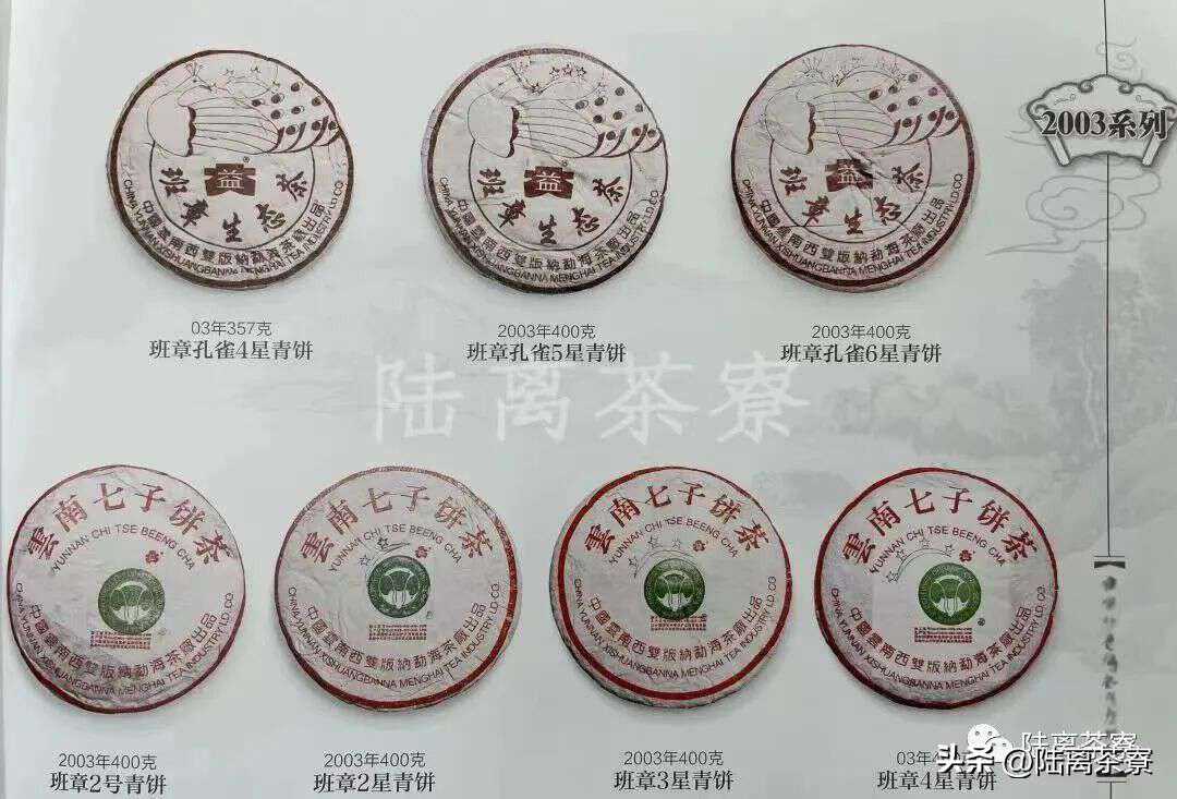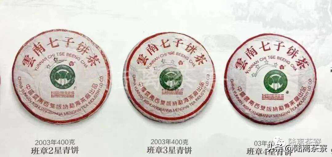 同样是2003年,班章大白菜也出现了星级标识,这年出品的班章2星、3星、4星青饼,包装上印有对应数量的群星伴月绿色印章标识,相对好辨认,除此以外还出品了几款沱茶,大白菜系列的种类更加丰富。