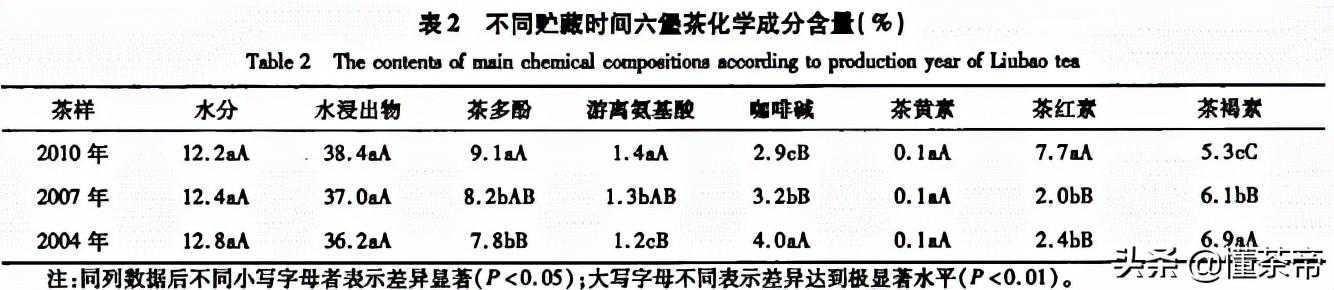 茶黄素、茶红素、茶褐素对茶汤颜色、叶底等都有重要影响,随着年份的延长,六堡茶中茶黄素含量较为稳定,茶红素逐年减少,而茶褐素则呈上升趋势,因此茶汤的颜色逐年加深。