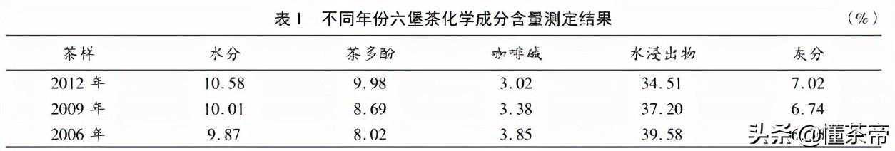 与之相反的是咖啡碱,咖啡碱随着年份的增加,不仅没有减少,反而含量越来越高,2010年的六堡茶中咖啡碱含量为2.9,而2007年、2004年的增幅分别达10%及37%。