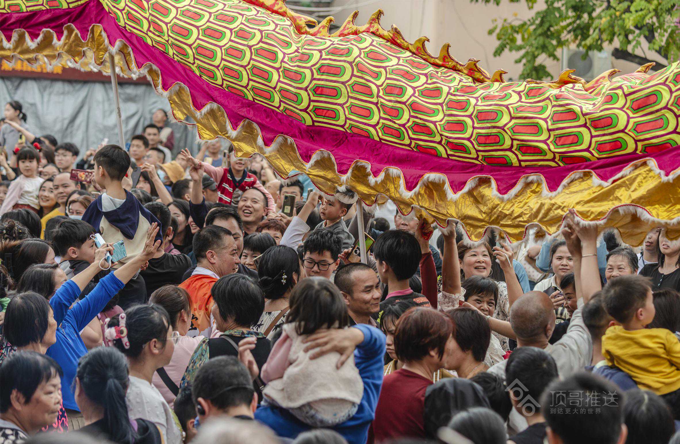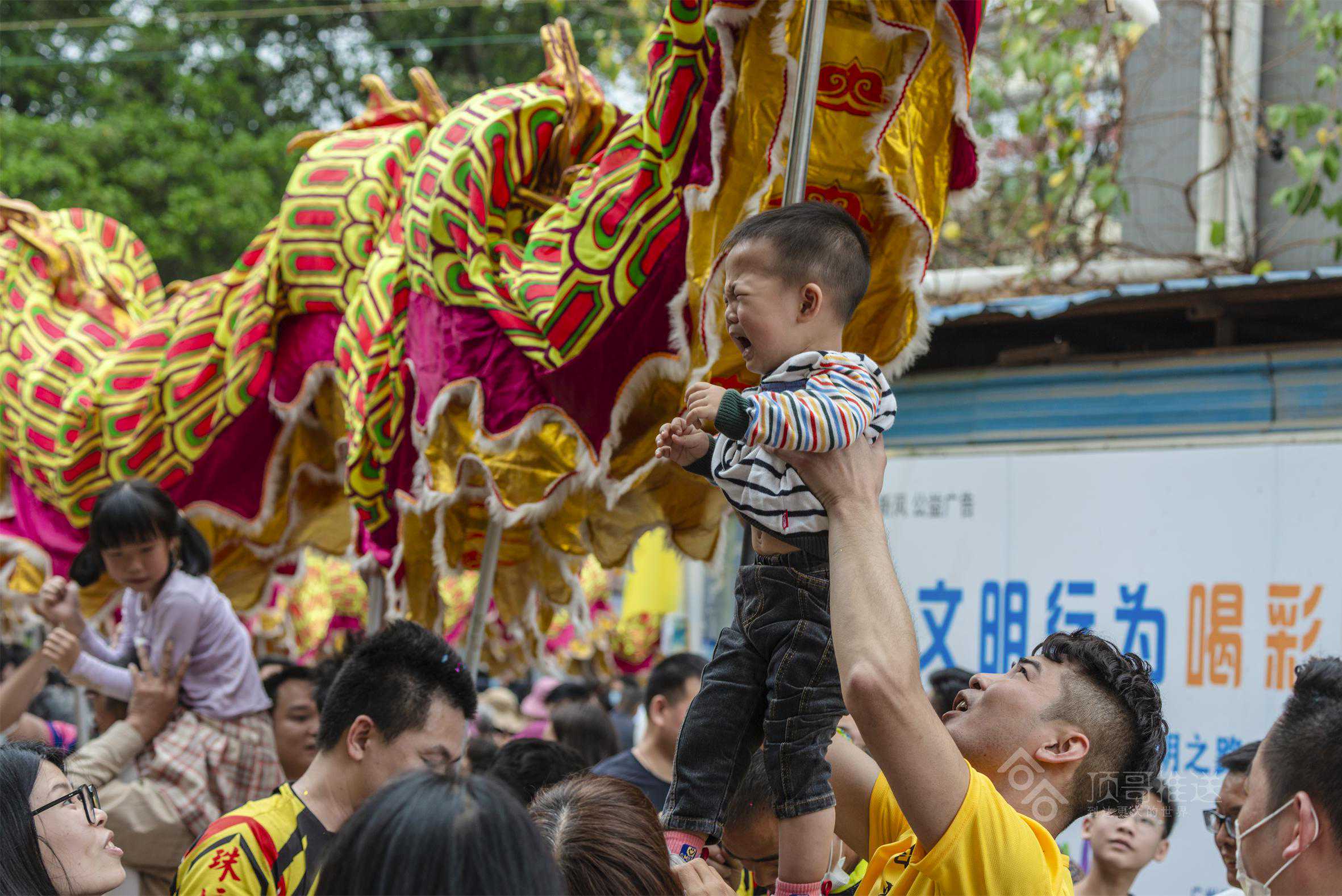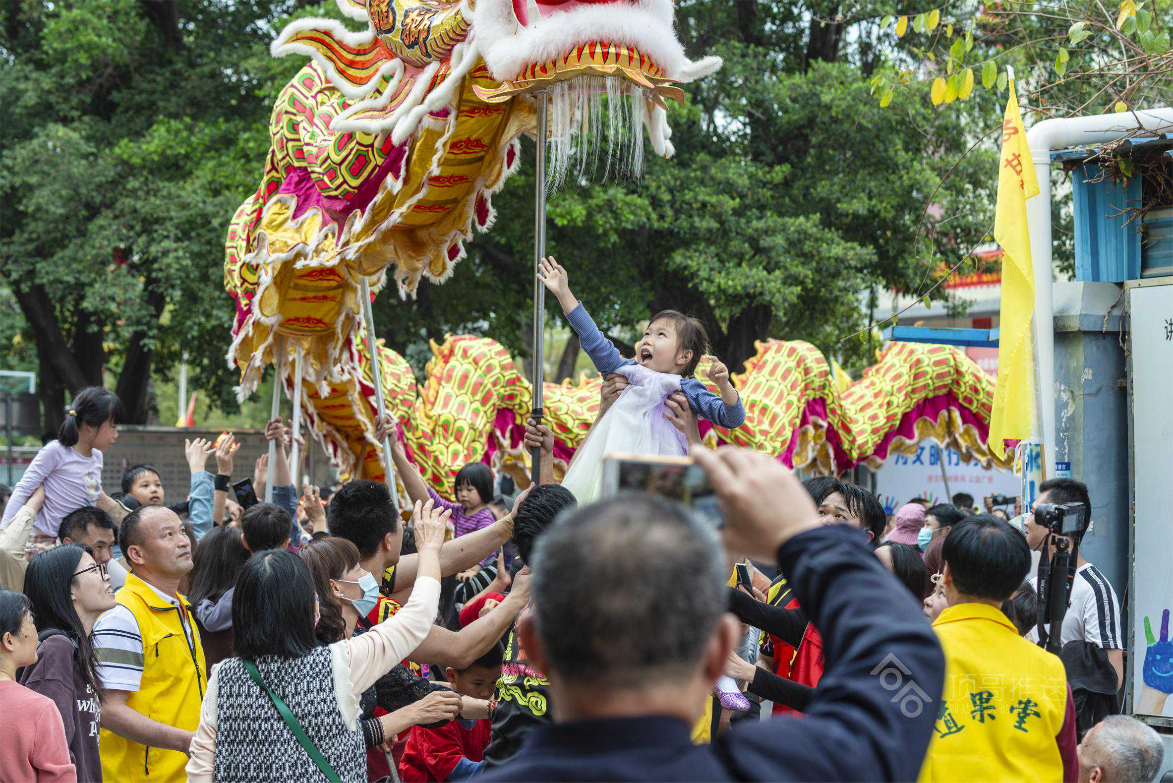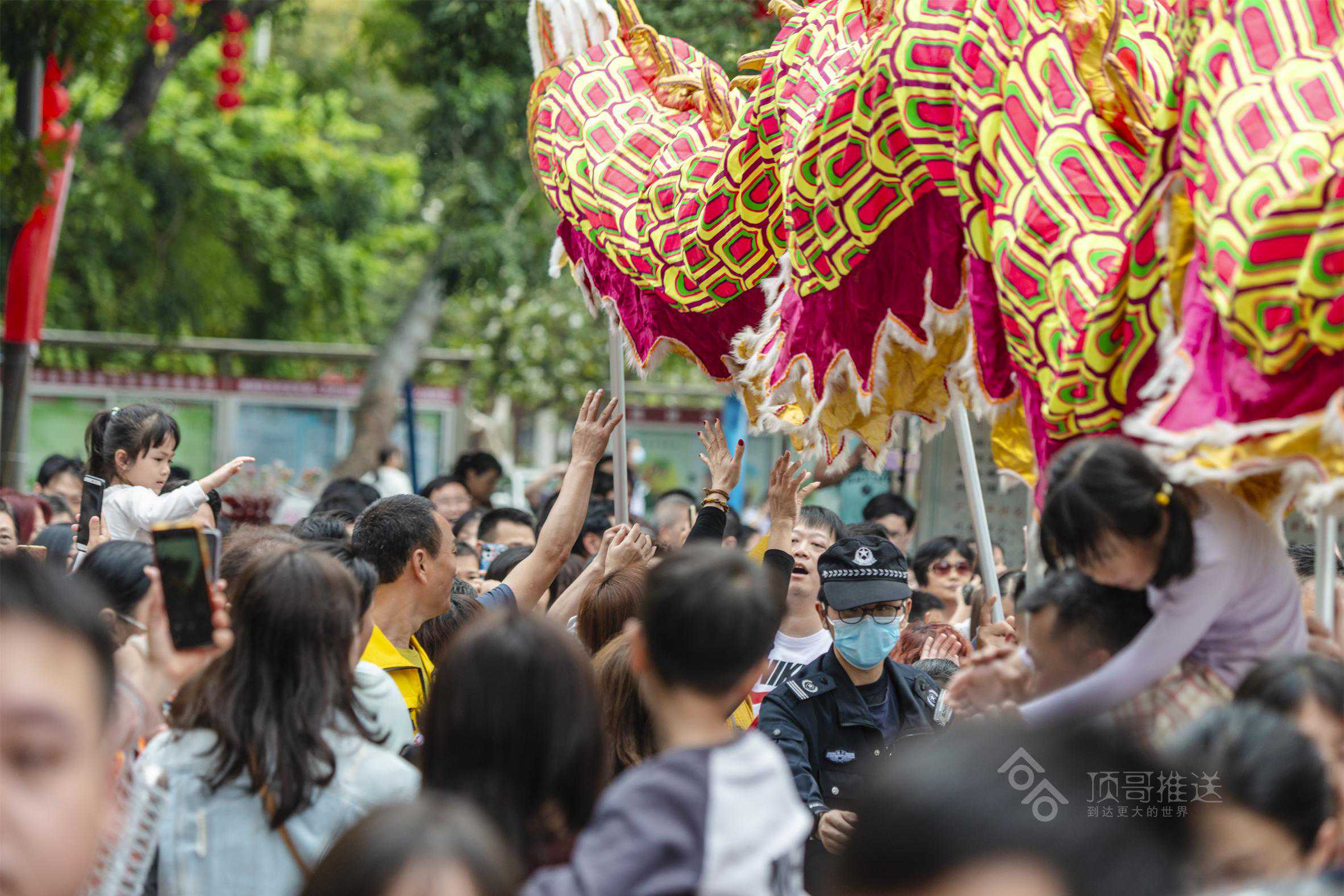 其中,给我印象最深的是“擝龙须”“采好意头”的吉祥民俗,在别的地方看舞龙,没有“擝龙须”的环节,在这,“擝龙须”一波比一波高潮,一路上,大人们跳得高高的,争先恐后把手伸向龙头擝龙须,还有大人高高把小孩举起擝龙须、摸龙身,祈福快高长大、健健康康!