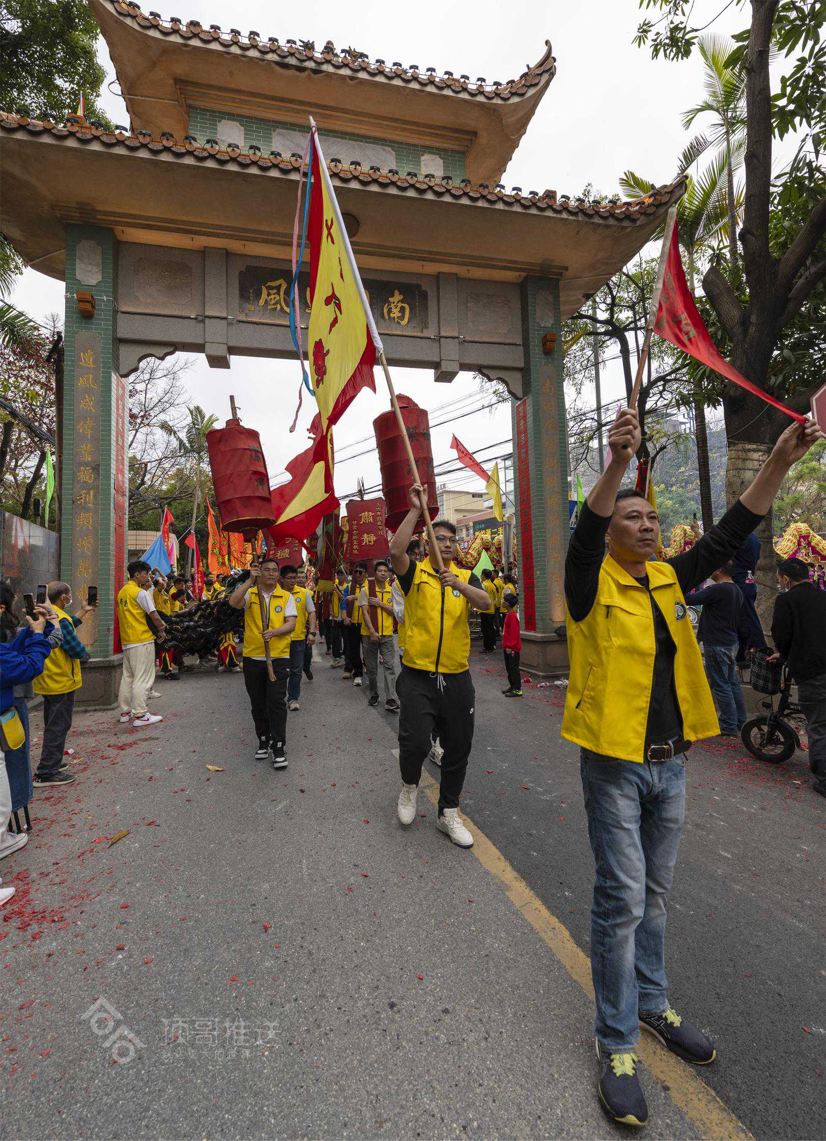 今年“当甲”是甘棠村,中午时分,甘棠村的舞龙队、舞狮队、花篮队、彩旗队、八音锣鼓队、生花牌匾队等早在村口牌坊敬候,准备“接神”,迎驾“关帝圣君”,按照“接神”“送神”的礼数和奏章交接完毕后,开始了“关帝圣君”全村祈福巡游活动。