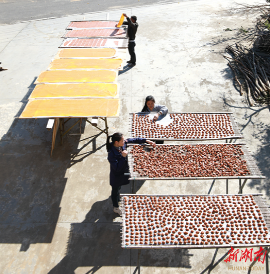 在浏阳大围山镇楚东村,农家趁晴好天气晾晒酸枣糕。秋末冬初,鲁霞珍总要做几批酸枣美食,“带核的叫酸枣粒,吃的时候会有一些回味;不带核的果肉制作酸枣饼,吃起来过瘾。”她的诀窍是,酸枣果肉蒸熟,加一些蒸熟的红薯和白糖一起搅拌至糊状,做成一个个小团子,晾晒后愈发软糯。