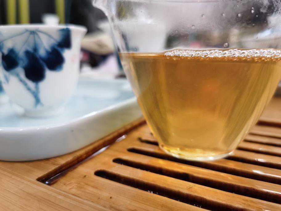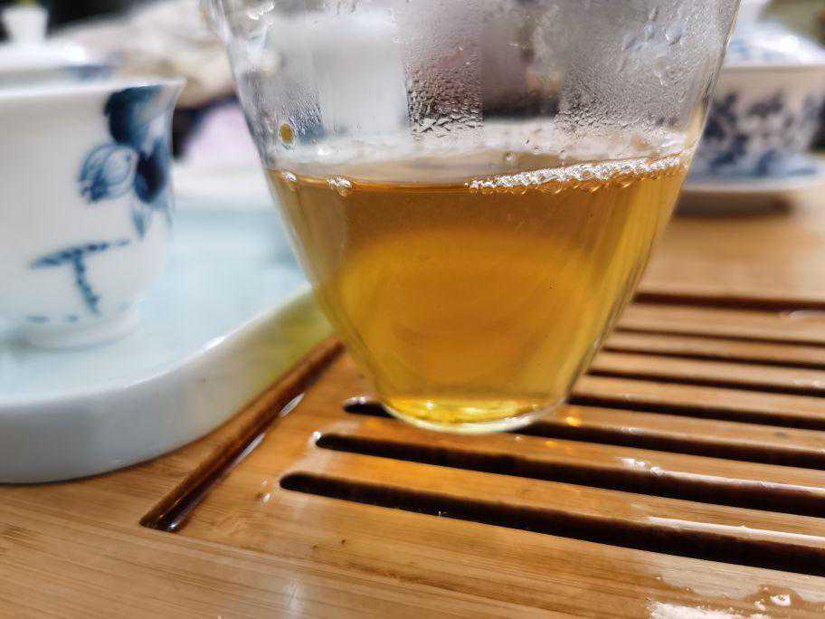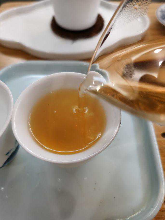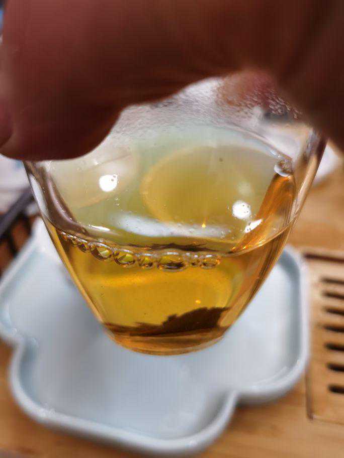 第一泡,7秒厚度不错,烟香不强,稍显淡薄,苦转回甘,生津即起,滋味稍淡,苦涩皆低,杯香留存,有回甘。冷杯时烟香倒是很明显。第二泡,7秒厚度又稠感,香味上看,青味混合着花果万香味,总体不高扬,烟香并不明显,苦底稍强了一点,涩感依旧不明显。生津回甘加强了不少,这一泡杯底香依旧浓郁。