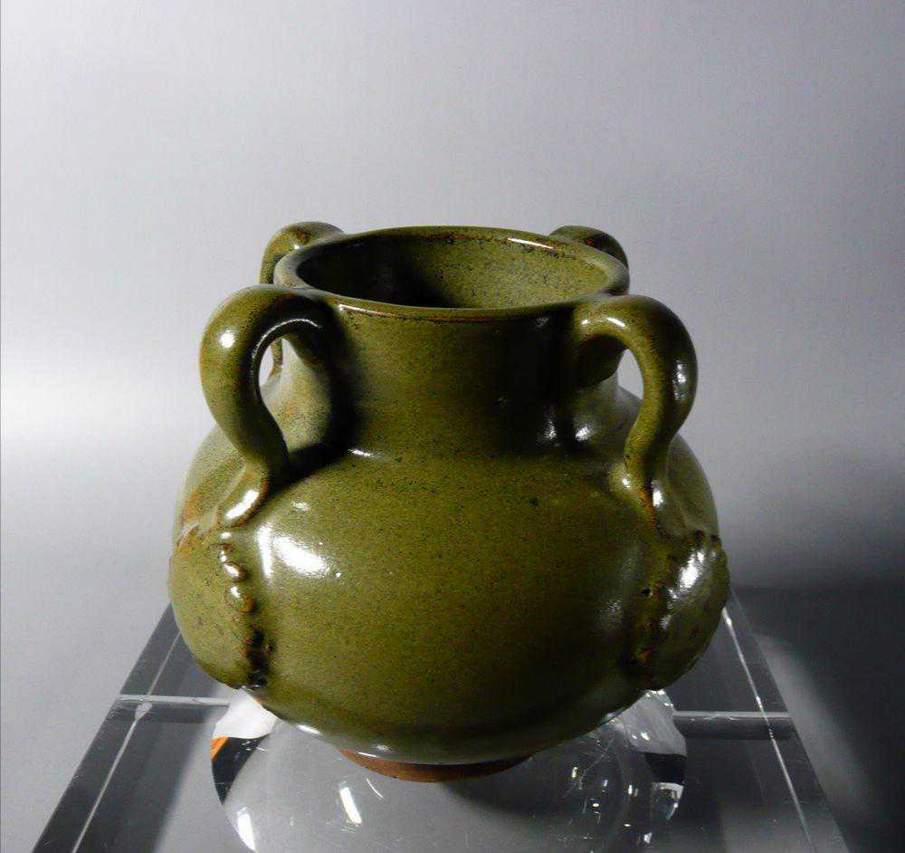 这件茶叶末釉四系罐,器型饱满,直口且深,四系下饰有绳纹斜格圆型贴塑。