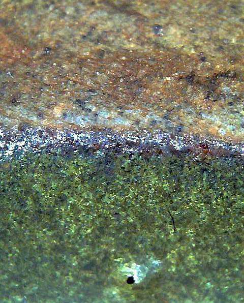 由于茶叶末釉,是结晶釉,故,老件器物微观可见~结晶花,釉面有茶有末,新器则无此特征。