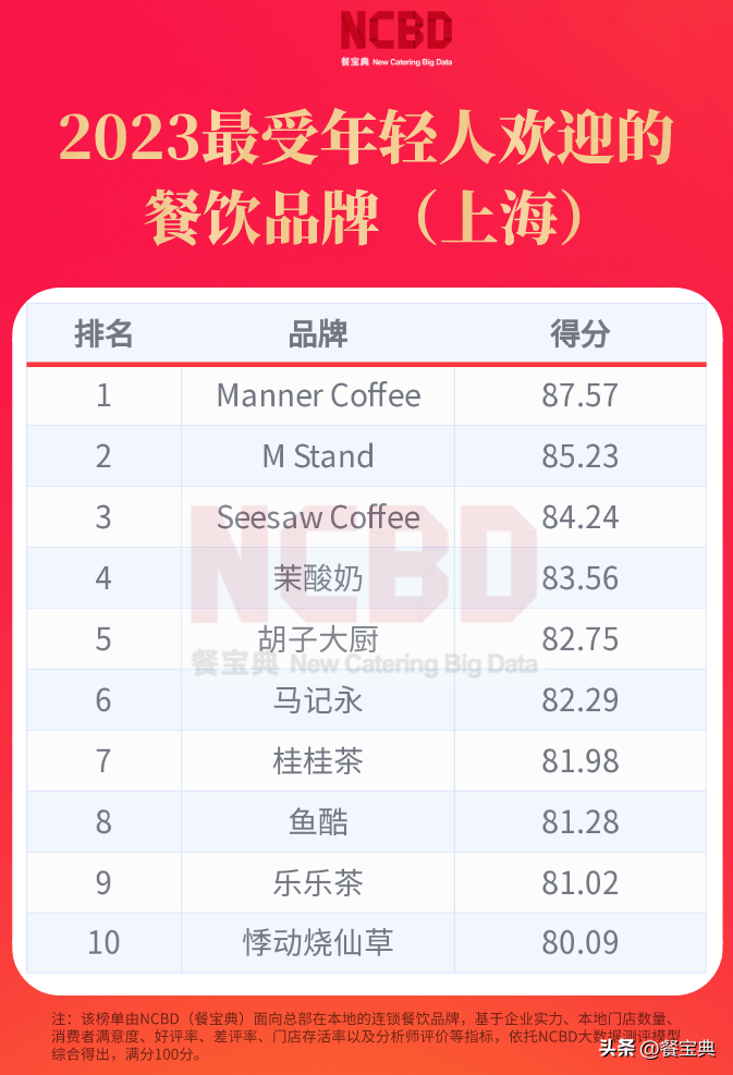 经过评审,最终登上“2023最受年轻人欢迎的餐饮品牌(上海)”榜单的有:MannerCoffee,MStand,SeesawCoffee,茉酸奶,胡子大厨,马记永,桂桂茶,鱼酷,乐乐茶,悸动烧仙草。