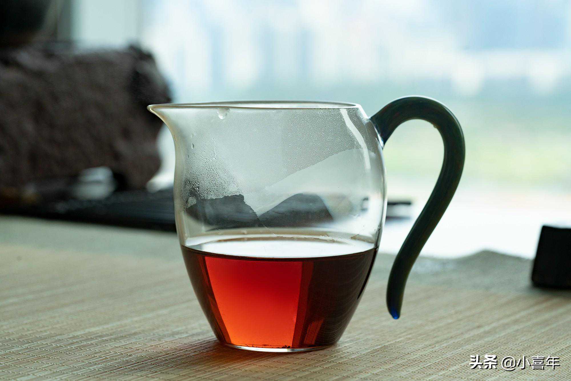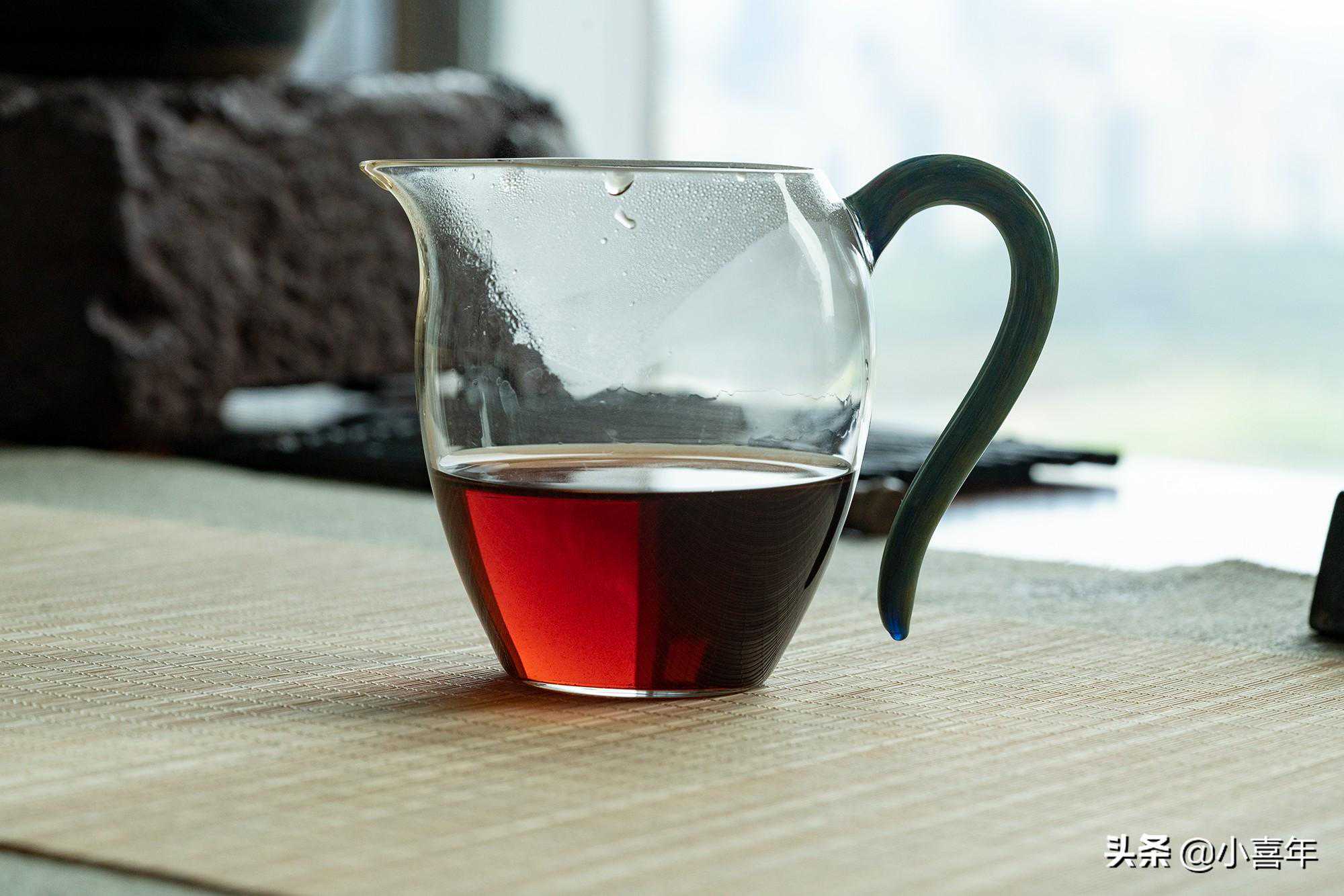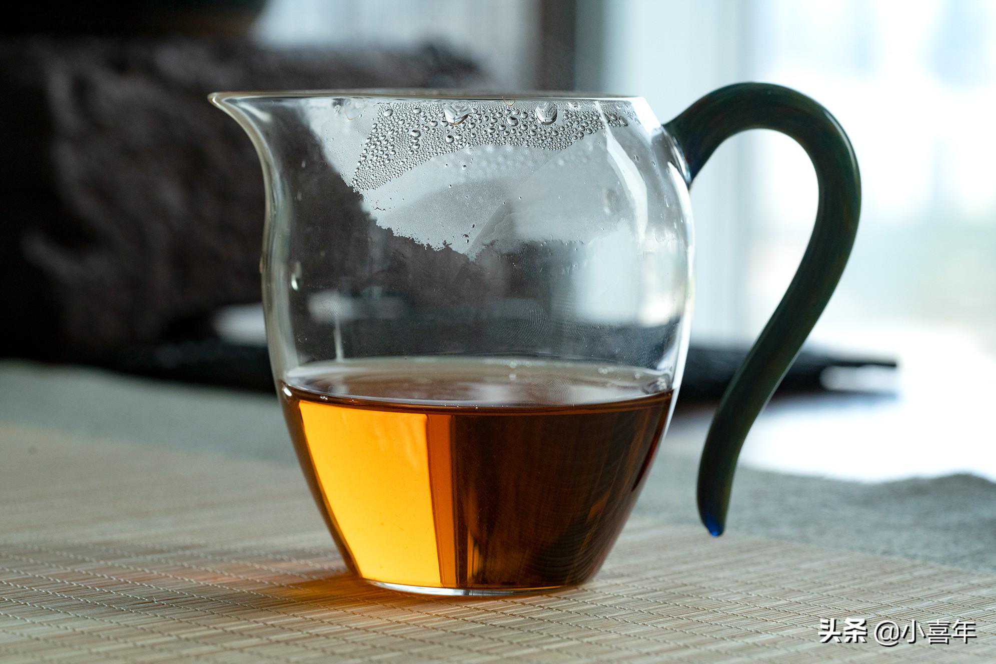 观玻璃公道杯中的汤色,前7泡红褐透亮,后面几泡颜色逐渐变浅。
