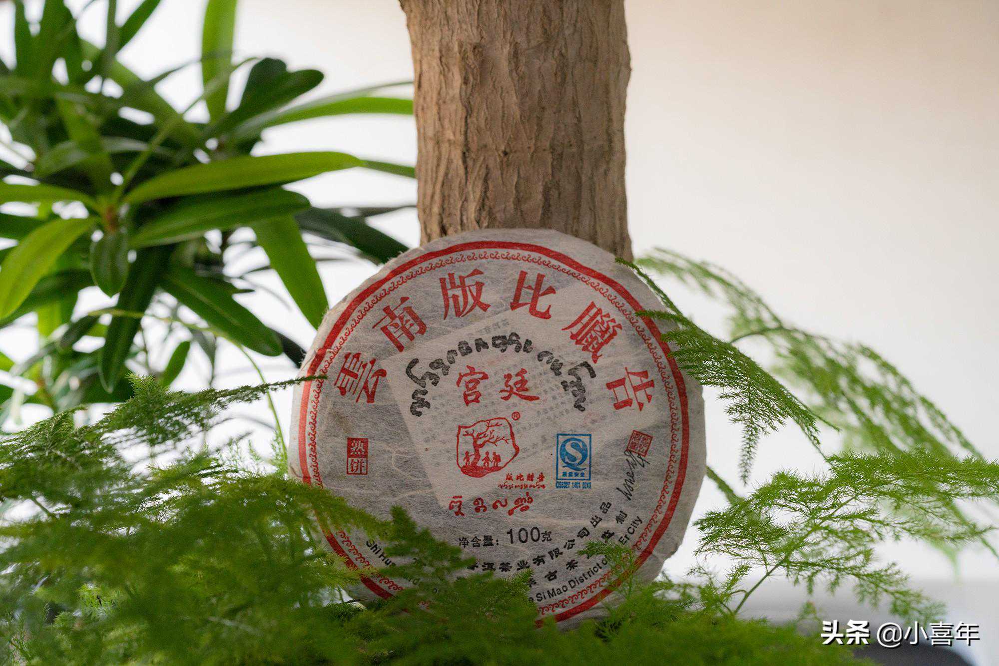 景迈古树宫廷小饼熟茶与正常357g茶饼对比